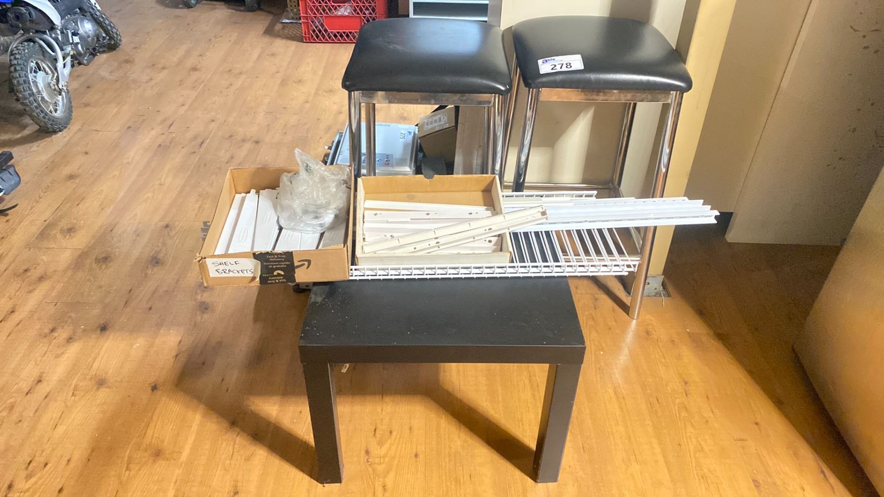 PAIR OF CHROME/ BLACK UPHOLSTERED BAR STOOLS, RUBBERMAID WALL SHELVING UNIT & CONTEMPORARY BLACK END TABLE