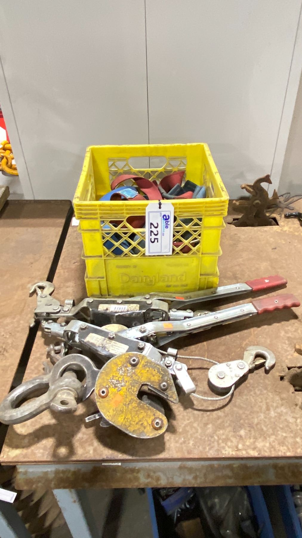 PAIR OF COME ALONGS, INDUSTRIAL SAFETY HARNESSES & HEAVY DUTY PLATE GRABBER * CRATE INCLUDED *