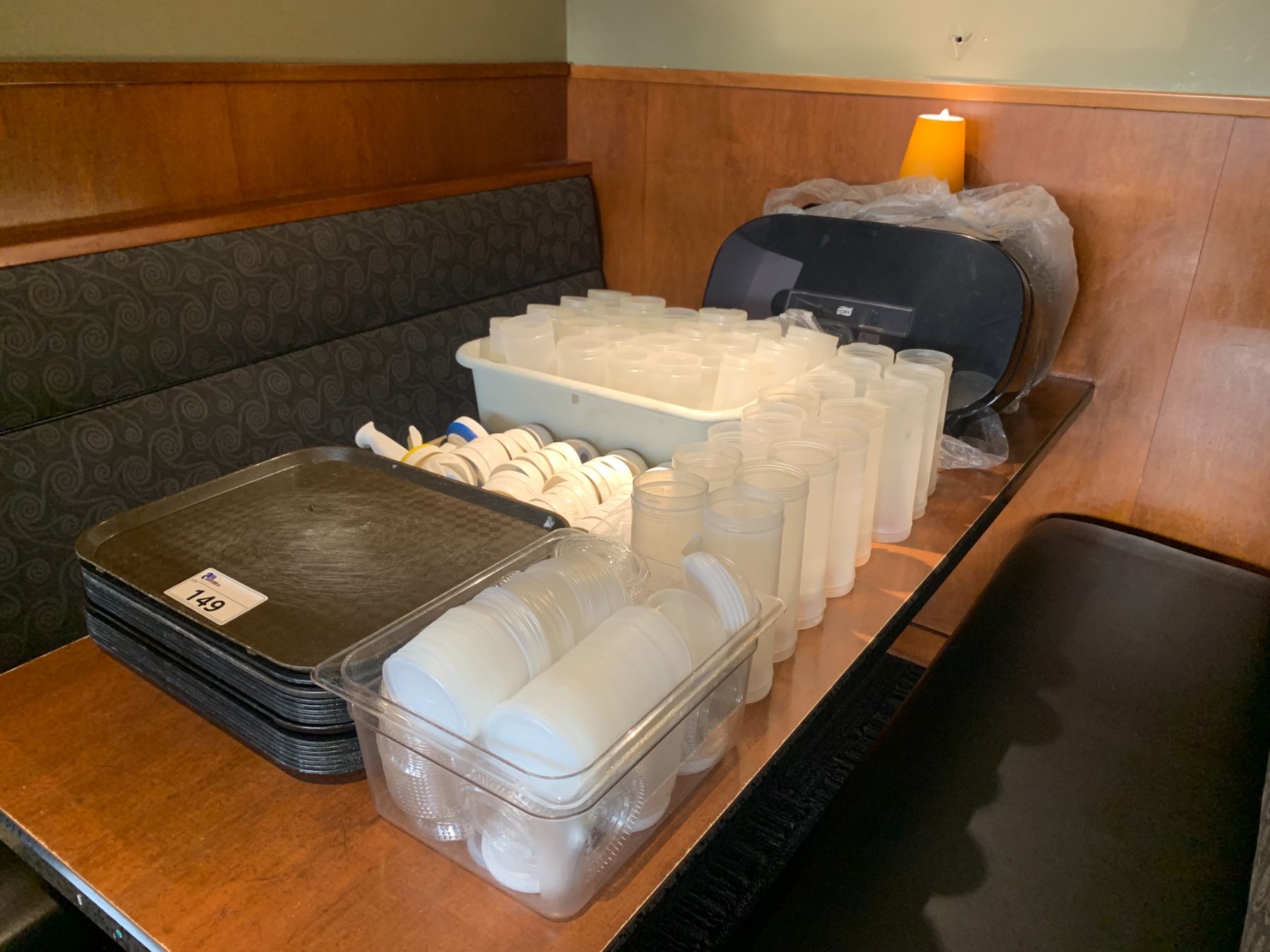 PAIR OF COMMERCIAL TORK TOILET PAPER DISPENSERS, ASSORTED DRESSING SQUEEZE BOTTLES WITH LIDS, CONTAINER OF PLASTIC TAKE OUT LIDS, & A STACK OF CAFETERIA TRAYS