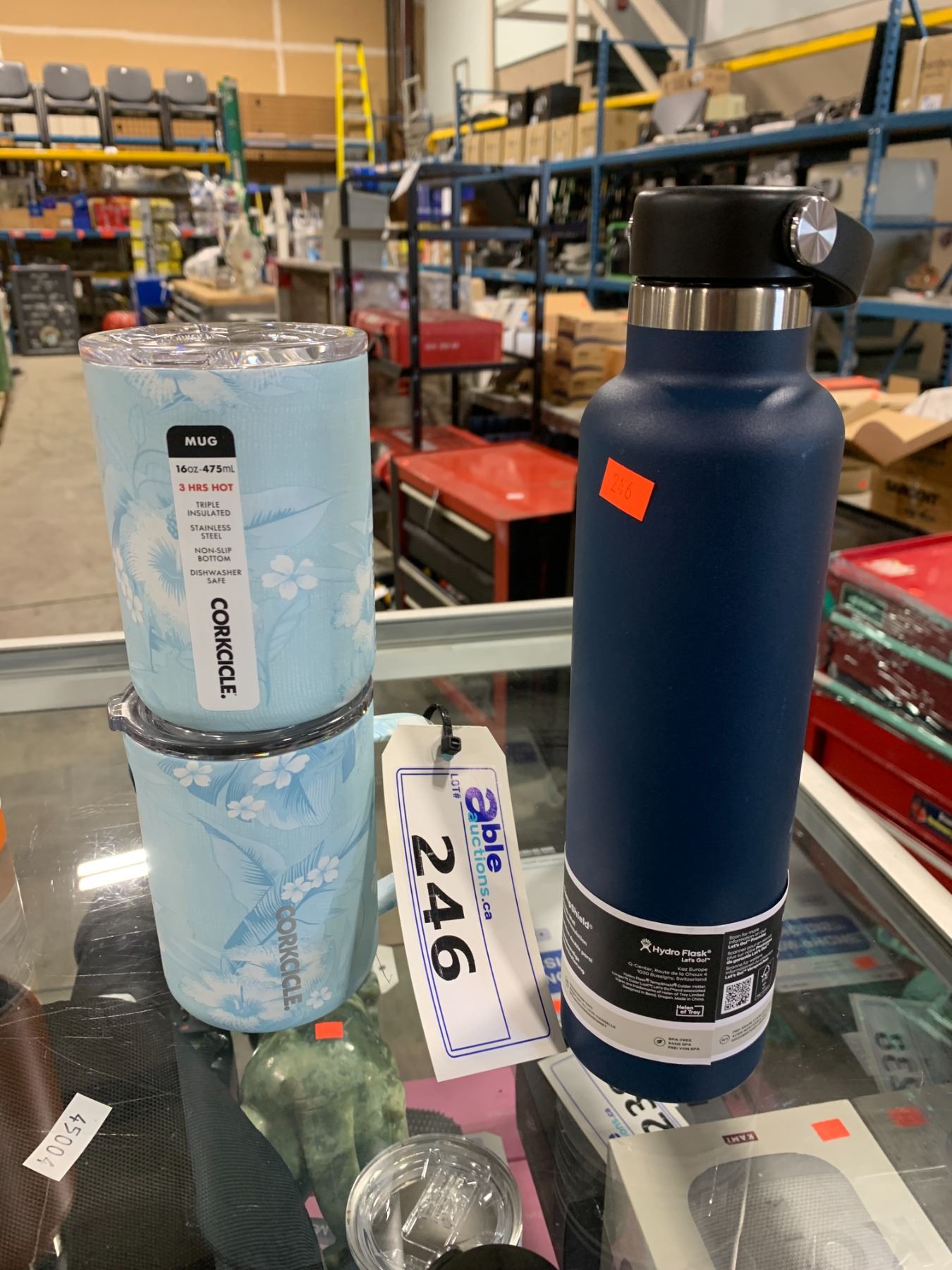 PAIR OF CORKCICLE 16OZ TRAVEL MUGS & A BLUE HYDRO FLASK