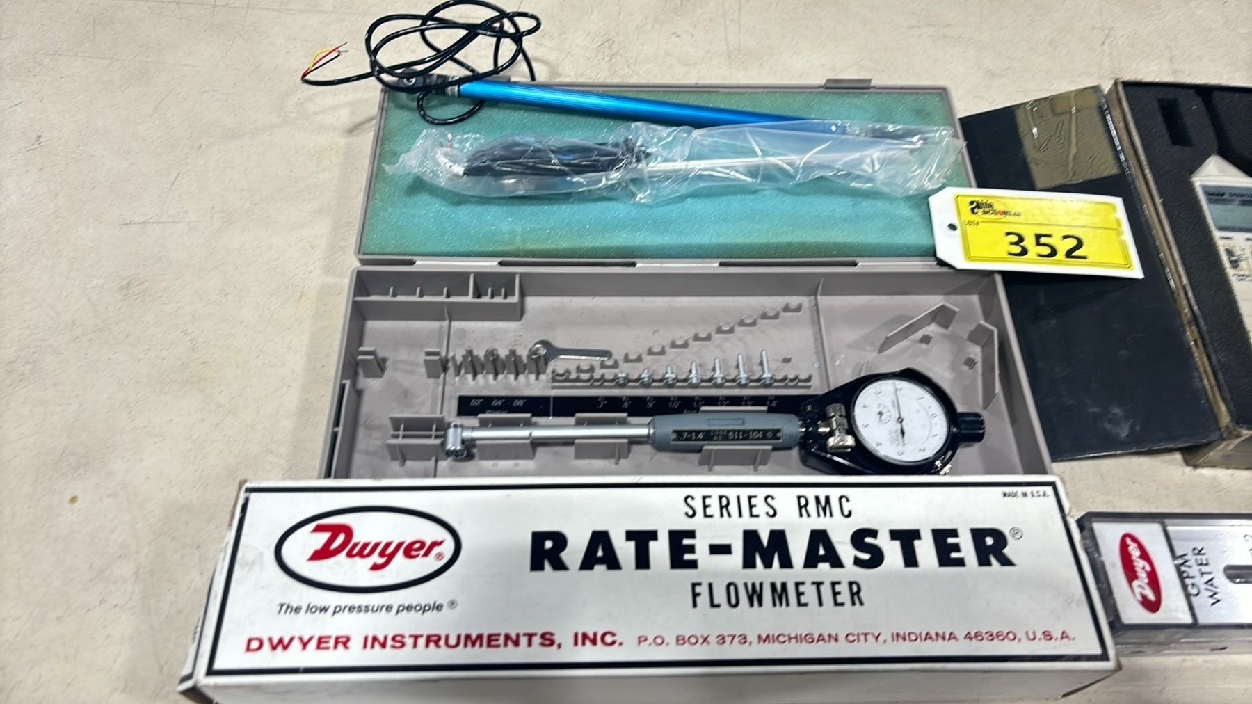 PAIR OF DWYER RATE-MASTER FLOWMETERS, CHATILLON DDP DIAL PUSH PULL GAUGE IN A HARD TRANSPORT CASE, UEI DSM100 DIGITAL SOUND METER, DIGITAL BORE GAUGE IN A HARD TRANSPORT CASE, & A PENNY + GILES LINEAR POTENTIOMETER & A POSITION SENSOR