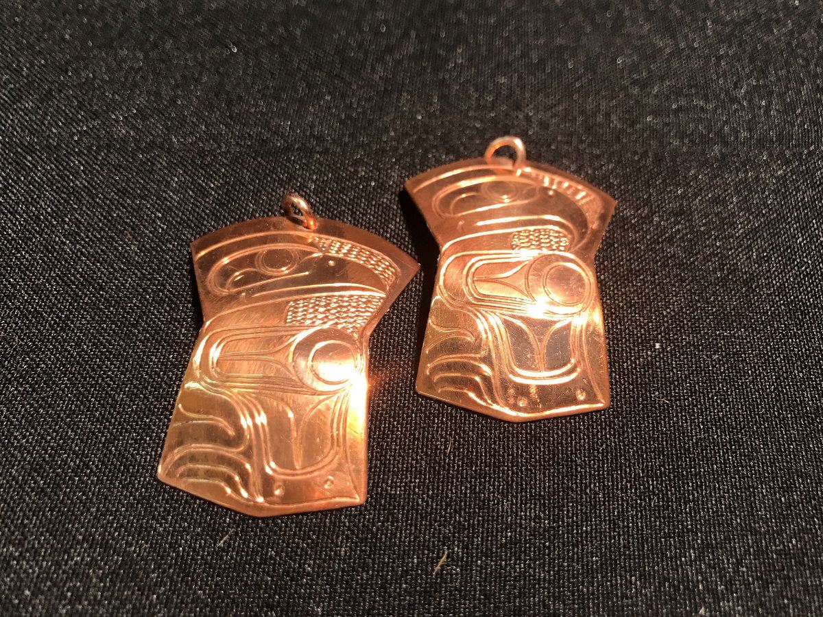 PAIR OF EAGLE & HAWK ENGRAVED COPPER EARRINGS STAMPED WITH ARTISTS INITIALS 'RD'