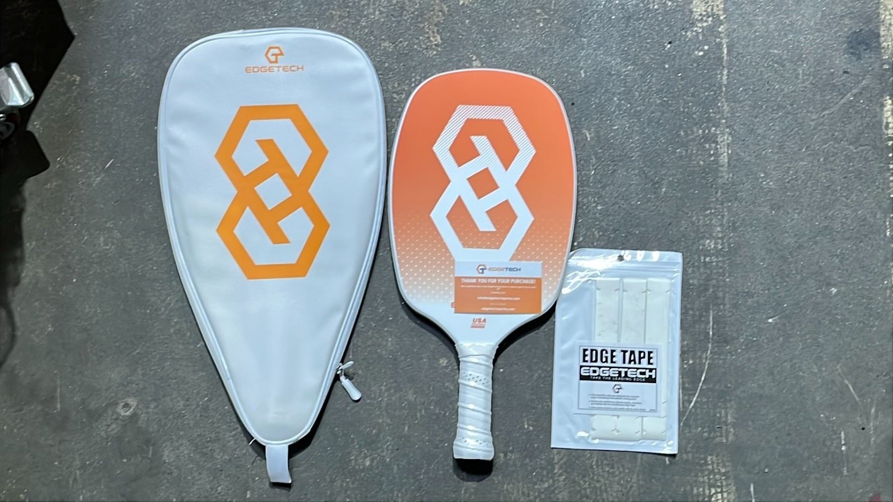 PAIR OF EDGETECH PICKLEBALL PADDLES IN A SOFT TRANSPORT CASE WITH EDGE GUARD TAPE INCLUDED