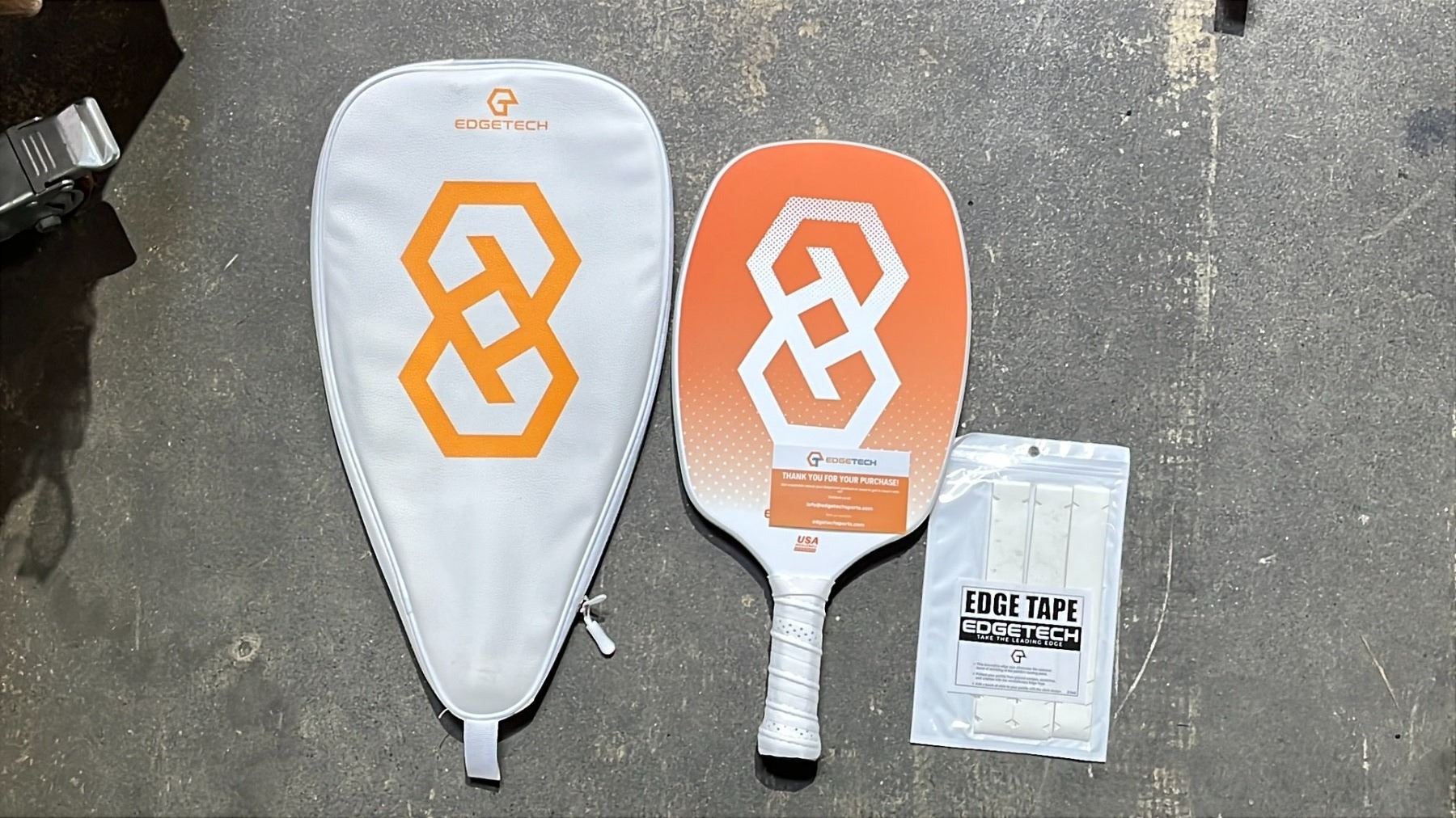 PAIR OF EDGETECH PICKLEBALL PADDLES IN A SOFT TRANSPORT CASE WITH EDGE GUARD TAPE INCLUDED
