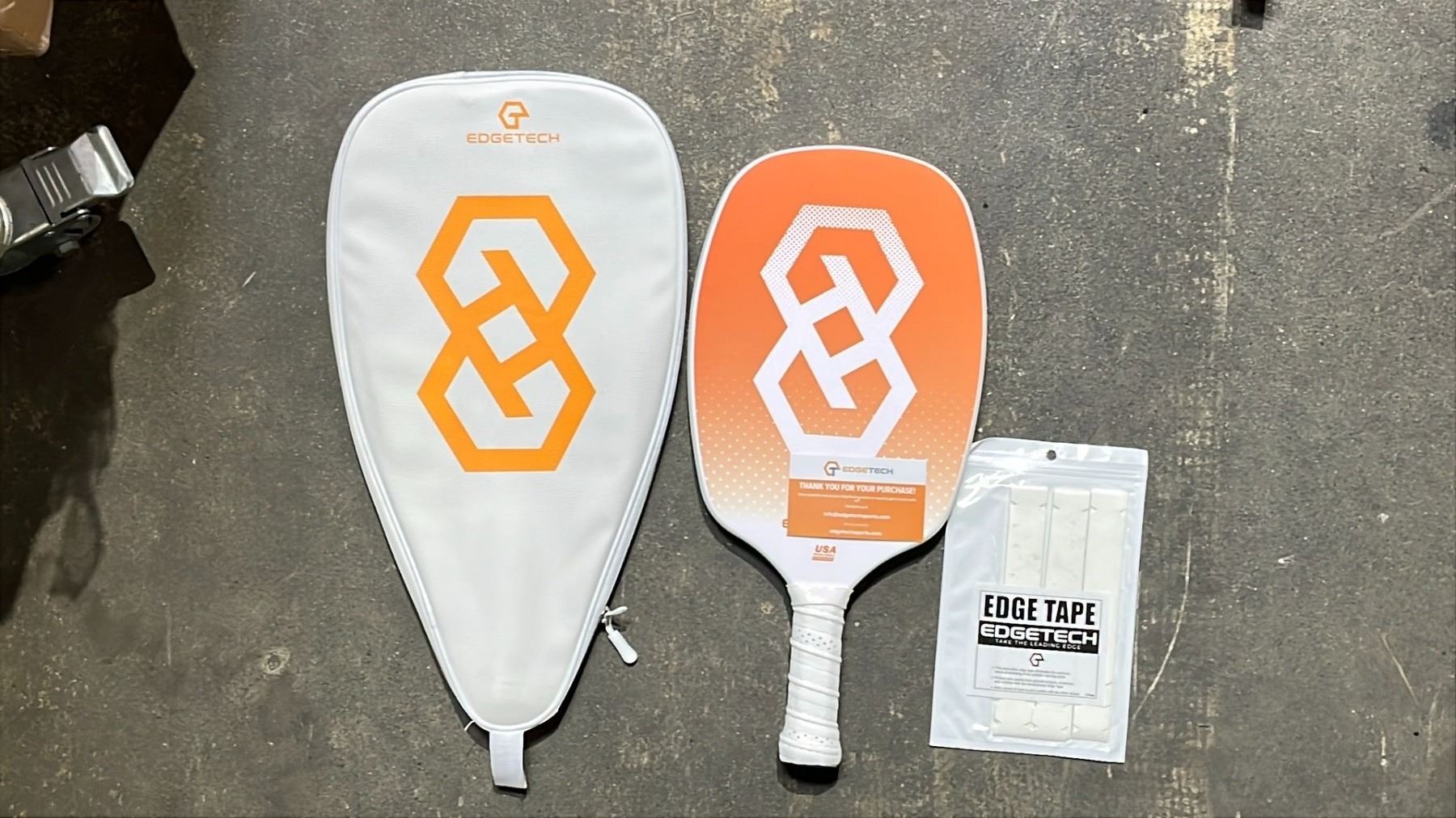 PAIR OF EDGETECH PICKLEBALL PADDLES IN A SOFT TRANSPORT CASE WITH EDGE GUARD TAPE INCLUDED