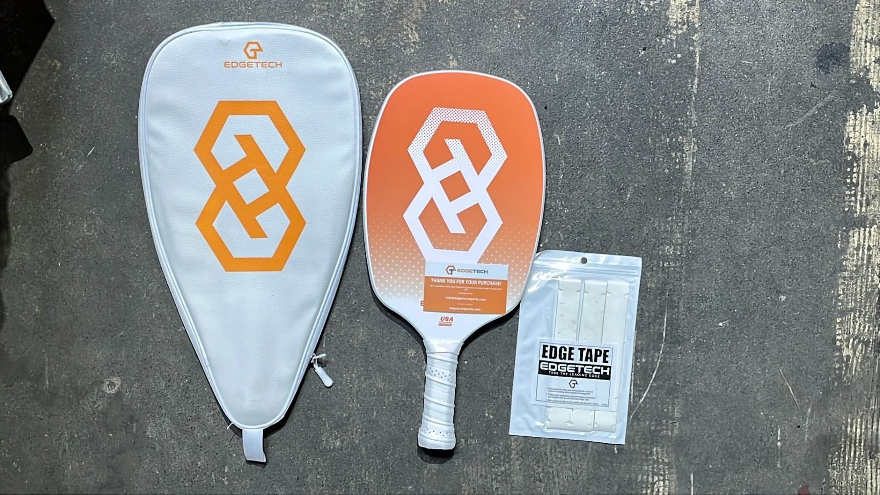 PAIR OF EDGETECH PICKLEBALL PADDLES IN A SOFT TRANSPORT CASE WITH EDGE GUARD TAPE INCLUDED
