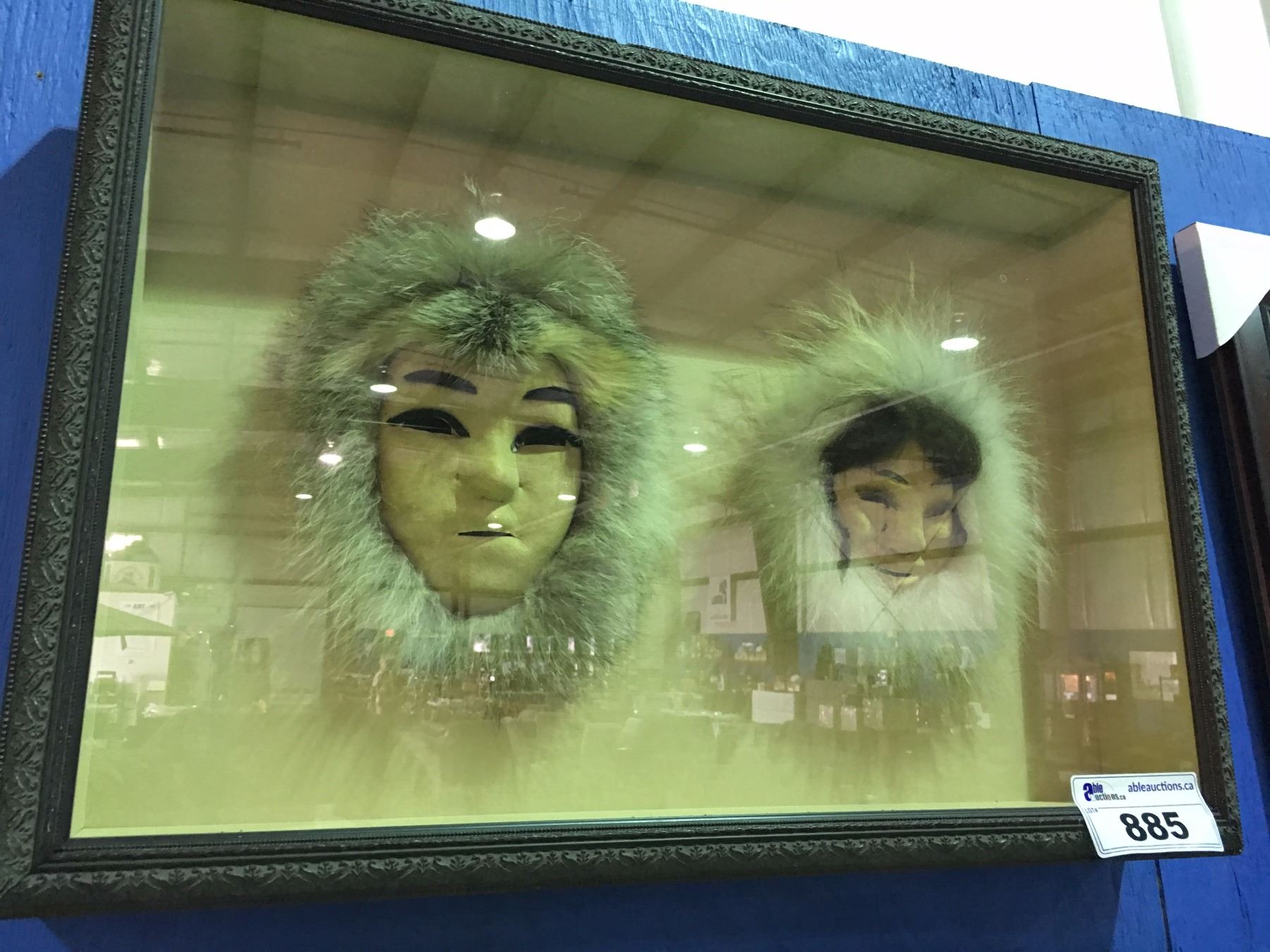 PAIR OF FIRST NATIONS INUIT LEATHER FUR LINED MASKS, FRAMED IN SHADOW BOX