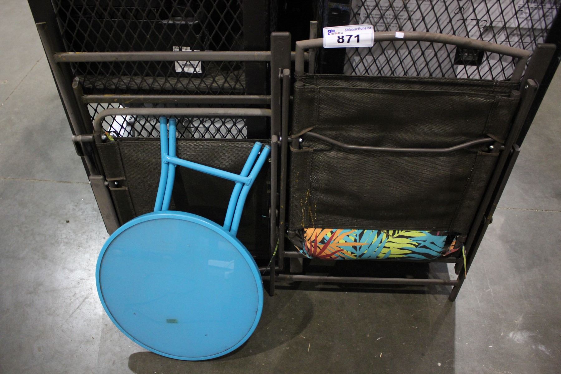 PAIR OF FOLDING PATIO CHAIRS AND BLUE FOLDING PATIO TABLE