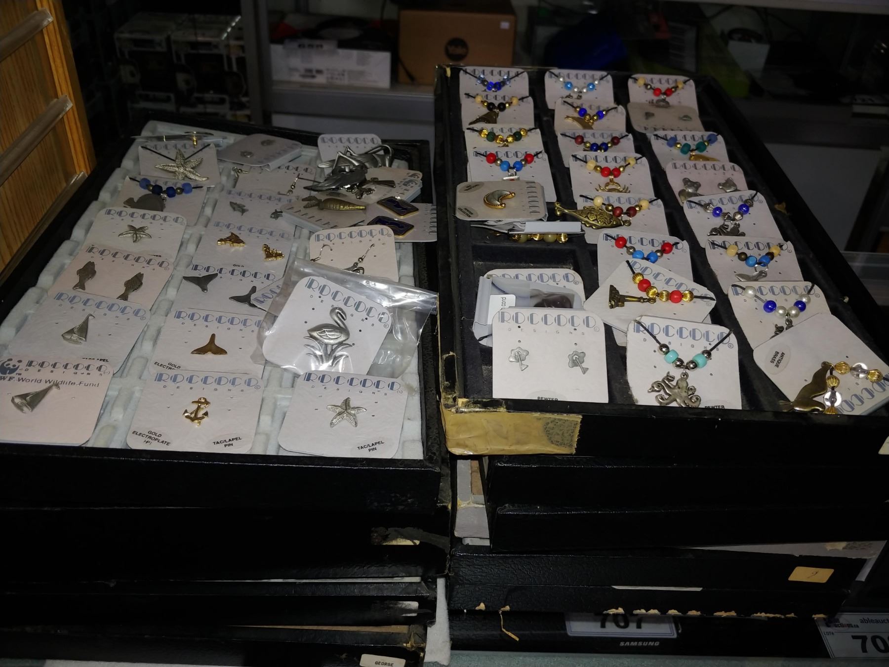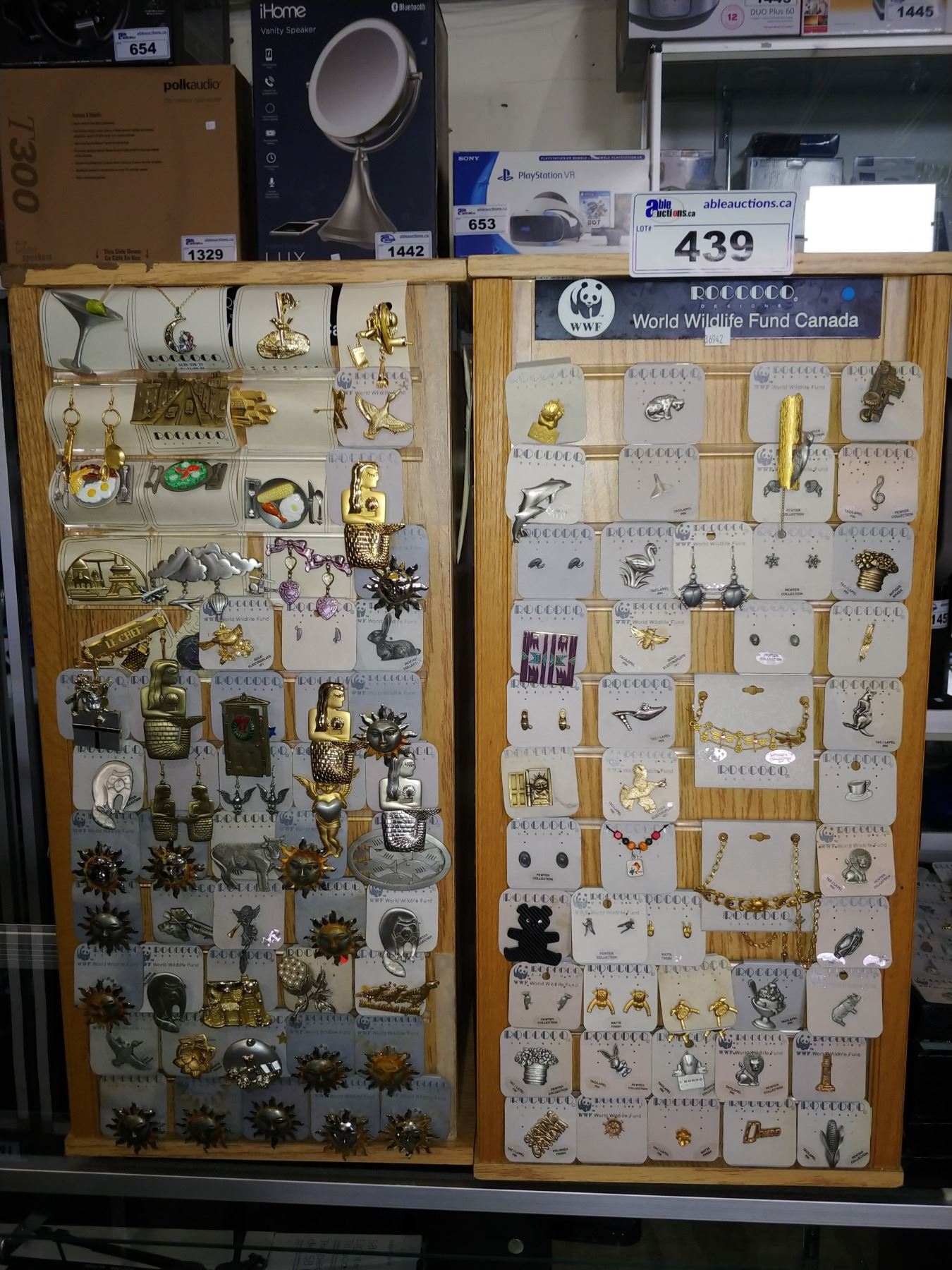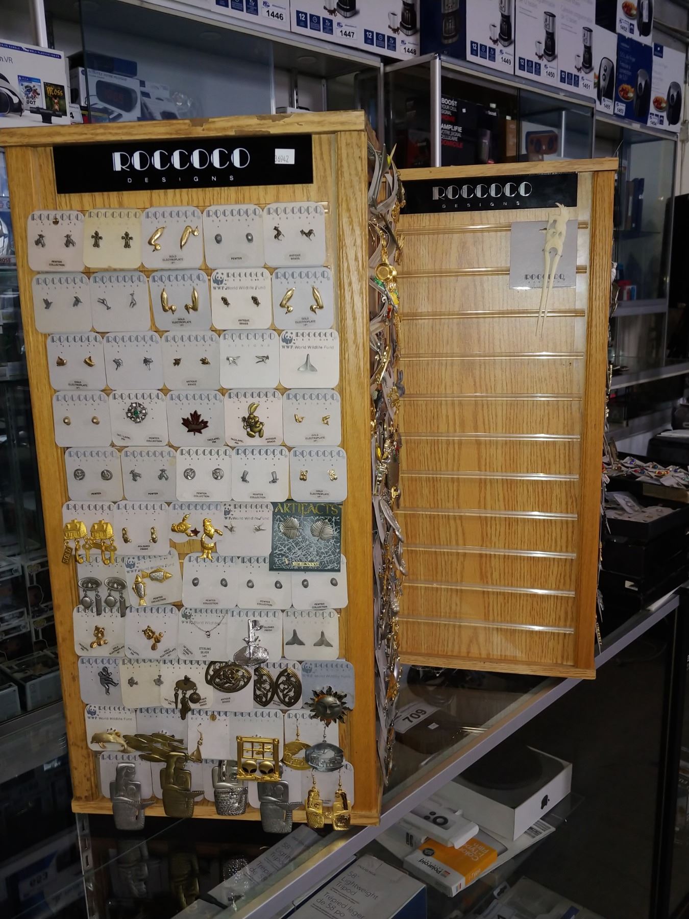PAIR OF FULLY STOCKED ROTATING WOOD ROCOCO DESIGN JEWELRY DISPLAY RACKS INCLUDING PEWTER, GOLD ELECTROPLATE, BRASS, STERLING SILVER AND MORE