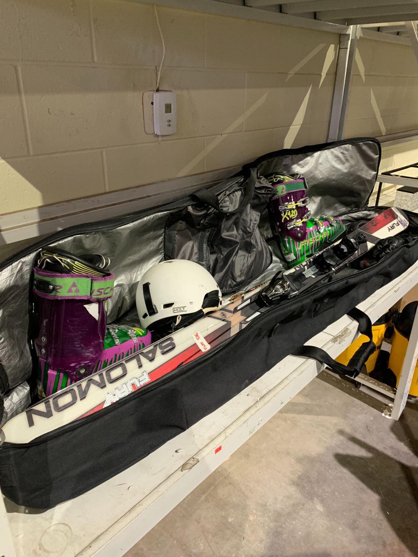 PAIR OF FURY SALMON SKIS WITH SCOTT SKI POLES, PAIR OF FISCHER BINDINGS, BURTON MOBILE CARRY BAG & MORE