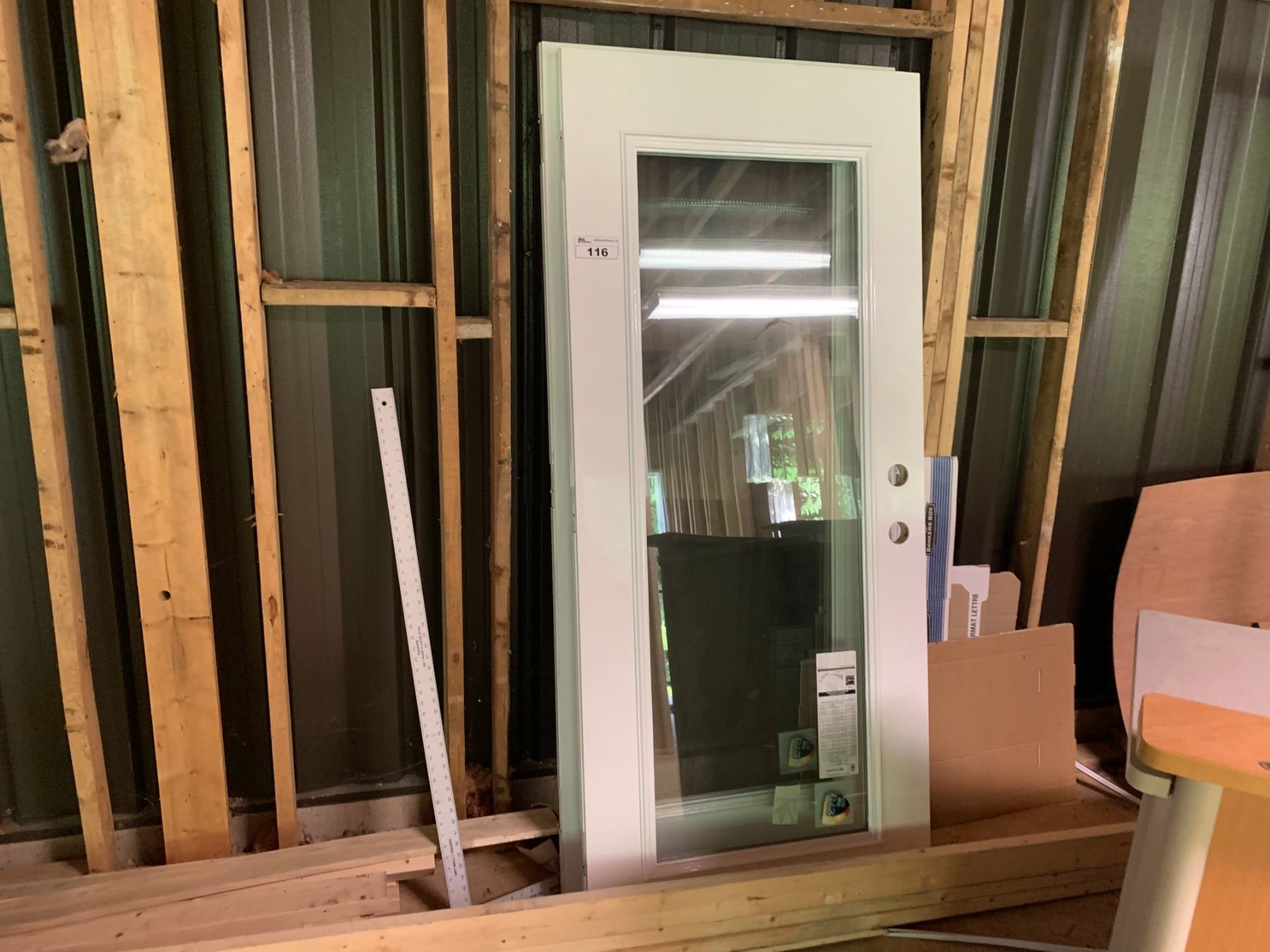 PAIR OF GLASS BAY DOORS WITH FRAME, ASSORTED LUMBER & BATHROOM DOOR