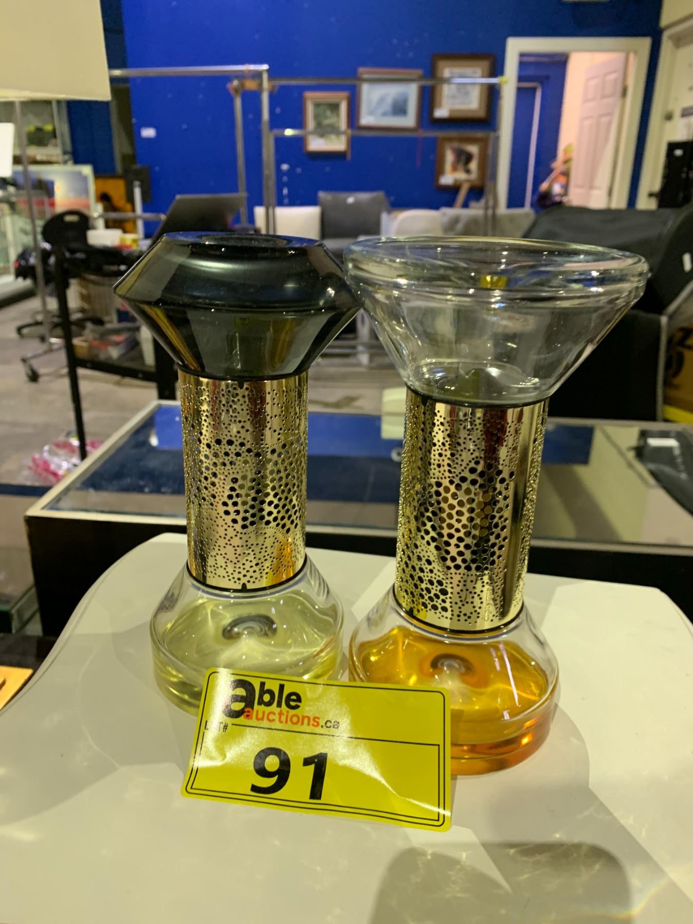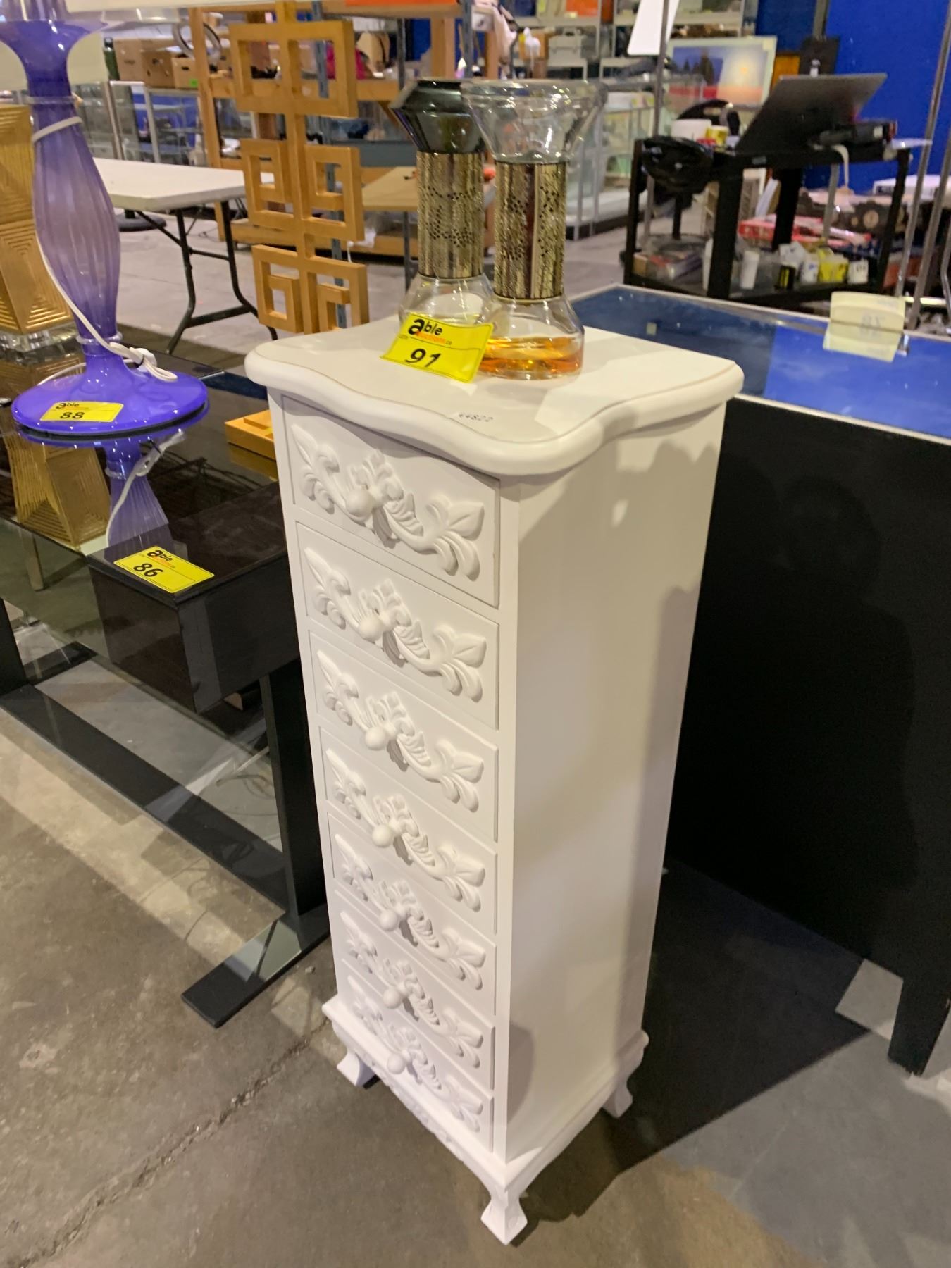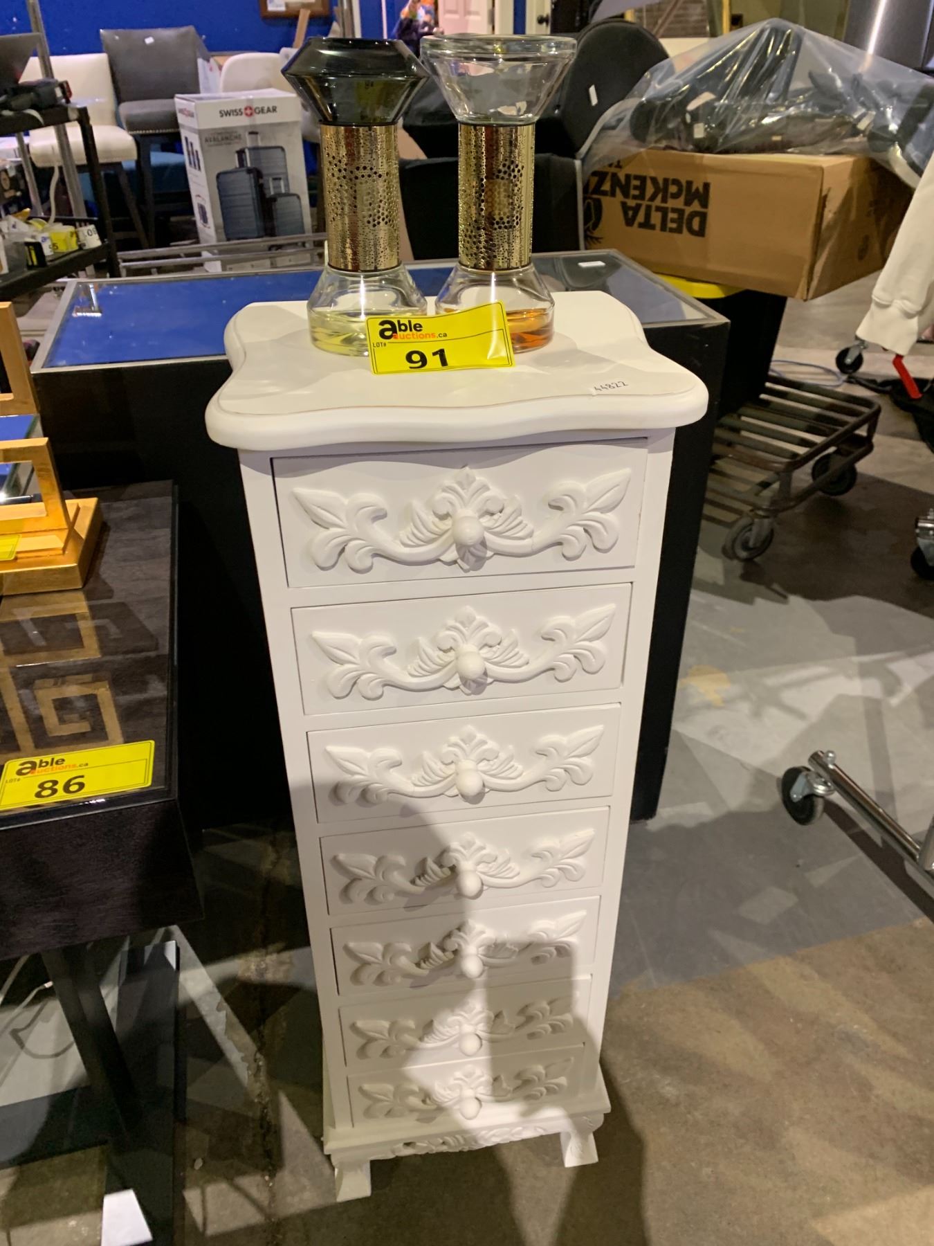 PAIR OF GLASS OIL DIFFUSERS AND 7 DRAWER PAINTED WHITE STAND