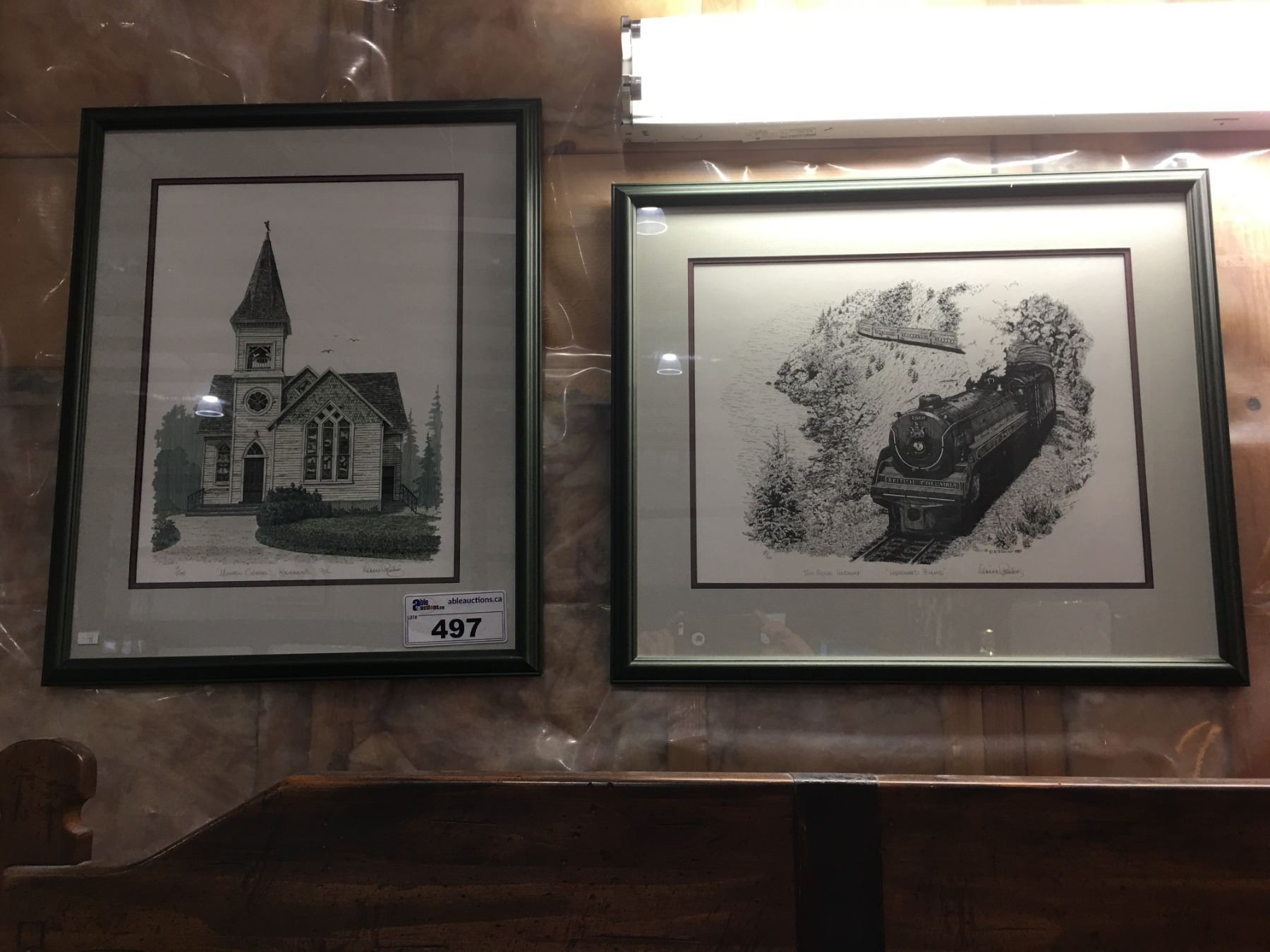 PAIR OF GREEN FRAMED LIMITED EDITION PRINTS "ROYAL HUDSON & MINORU CHAPEL"