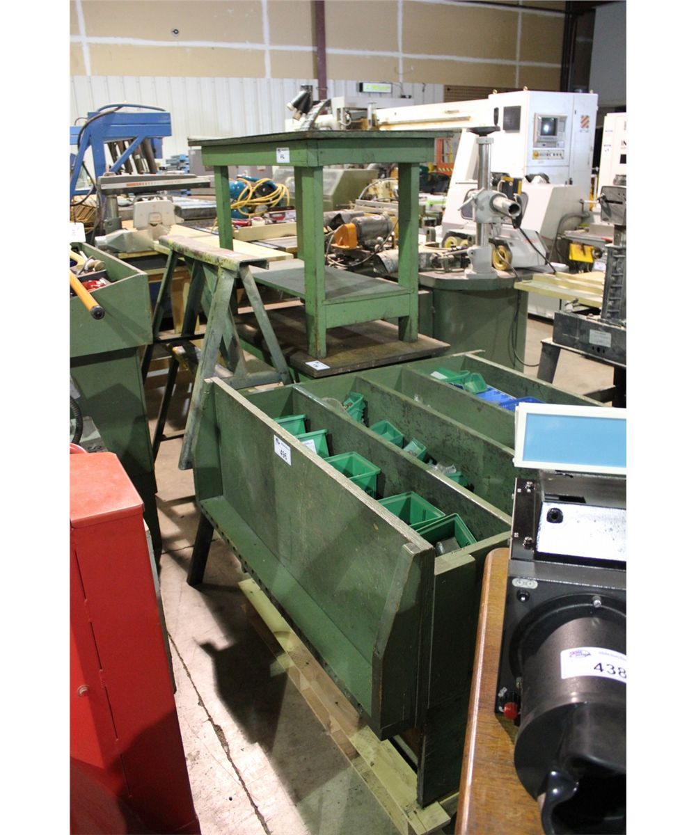 PAIR OF GREEN WOODEN WORK BENCHS, 2 SHELVES, CONTENTS AND 2 METAL SAW HORSES