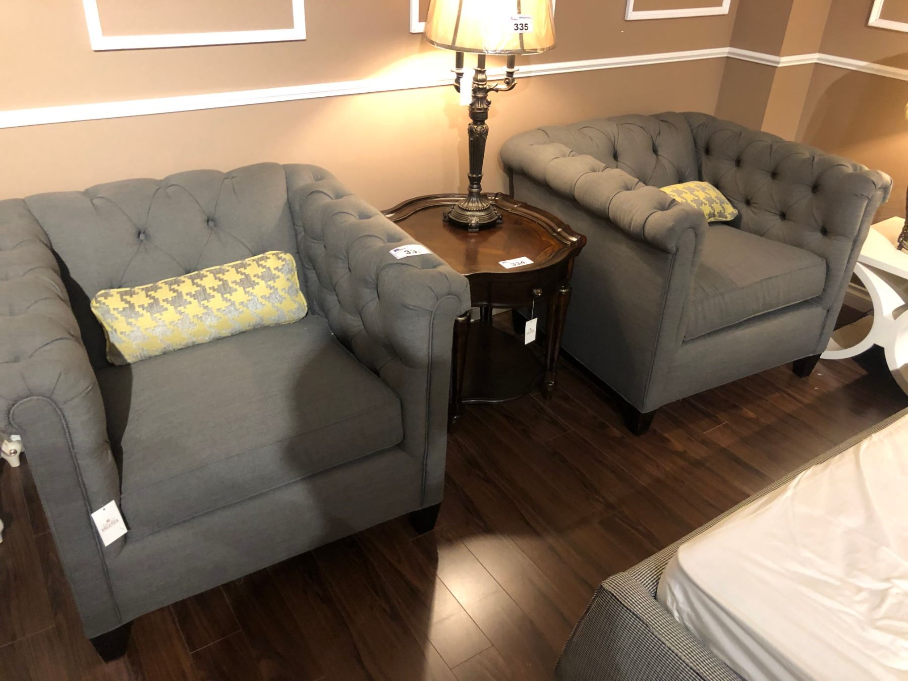 PAIR OF GREY TUFTED BACK CLUB CHAIRS.