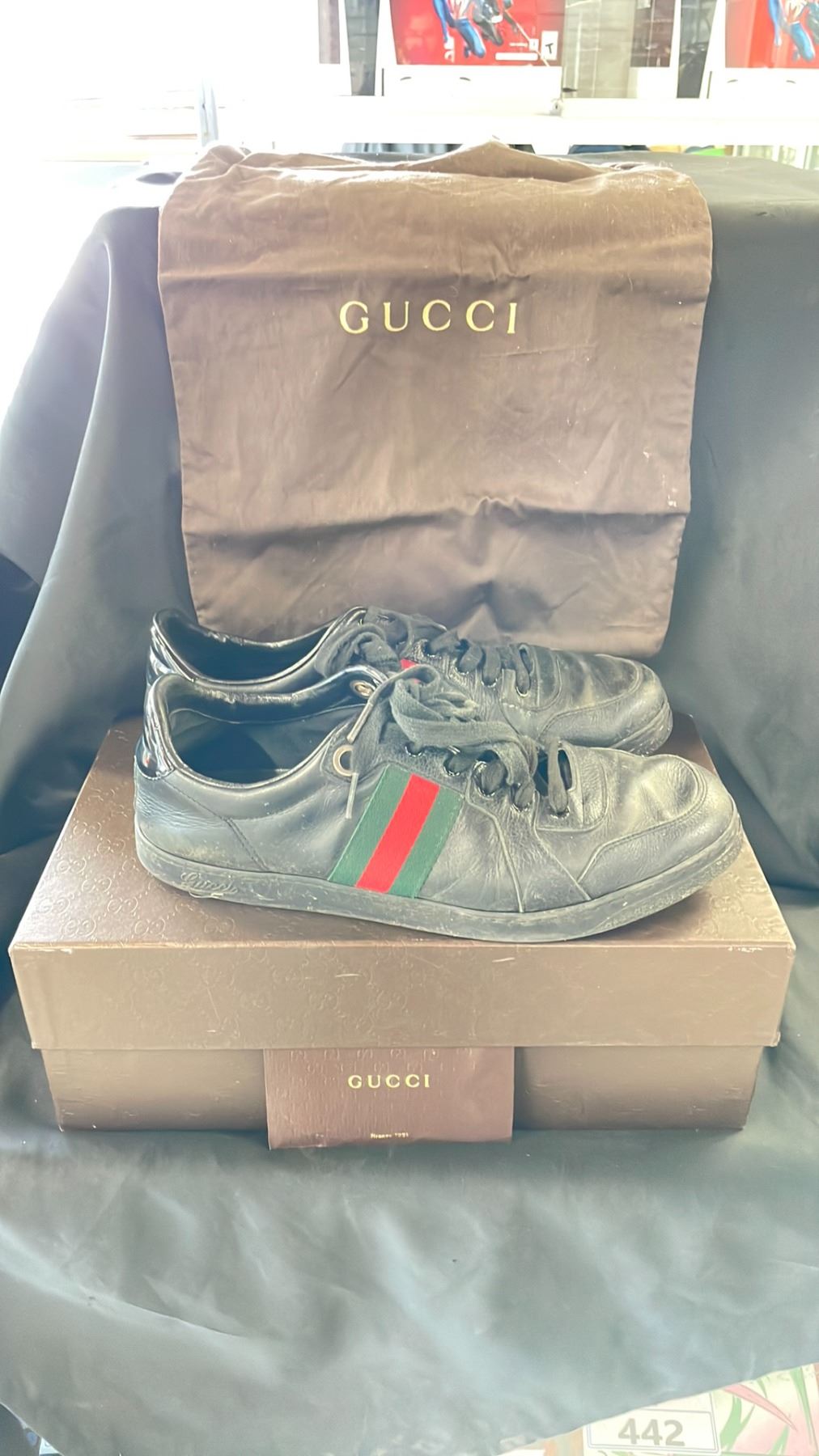 PAIR OF GUCCI SHOES SIZE 10 WITH ORIGINAL BOX, ORIGINAL PURCHASE RECEIPT & DUST BAG $554.40 RETAIL VALUE