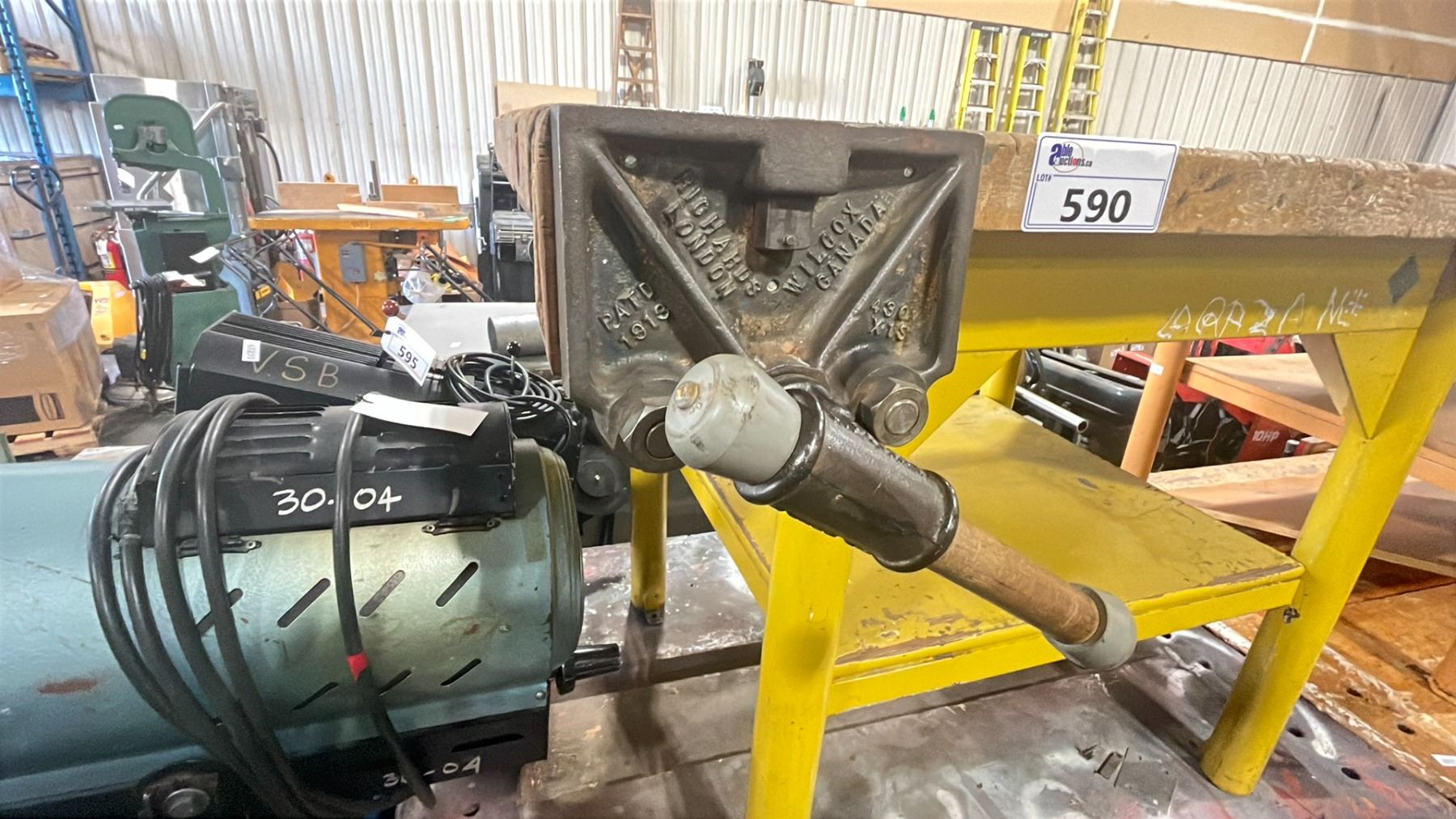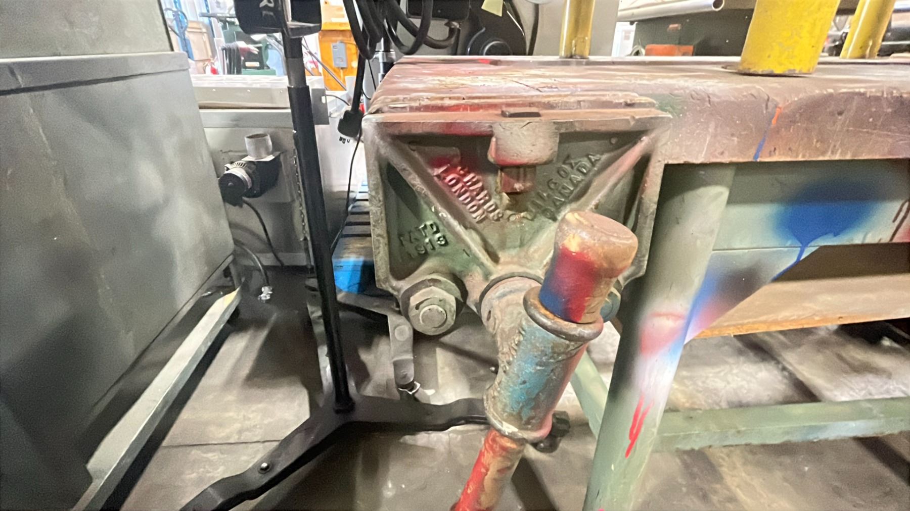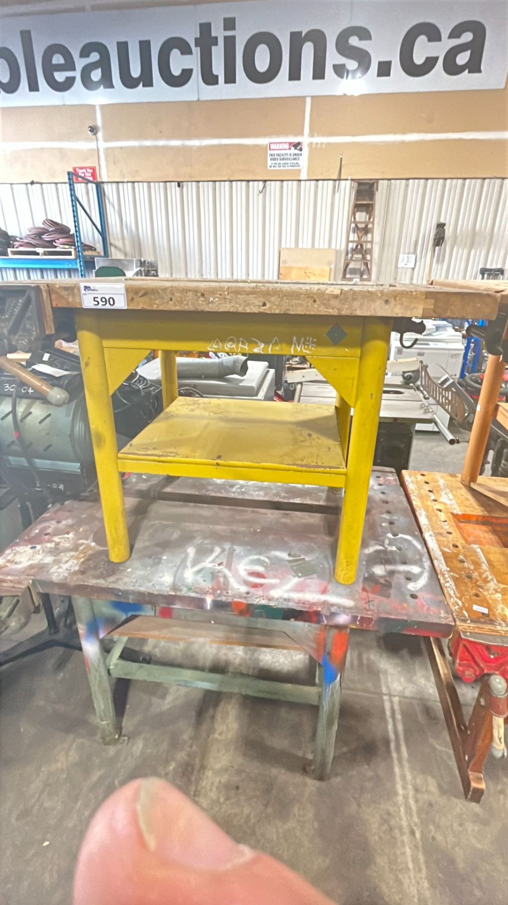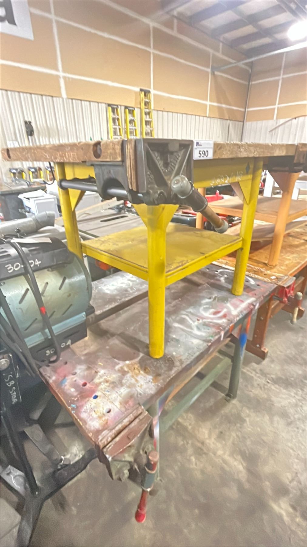 PAIR OF INDUSTRIAL WORK TABLES DIFFERENT SHAPES AND DIMENSIONS BOTH WITH TWO TABLE VISES ON EITHER SIDE