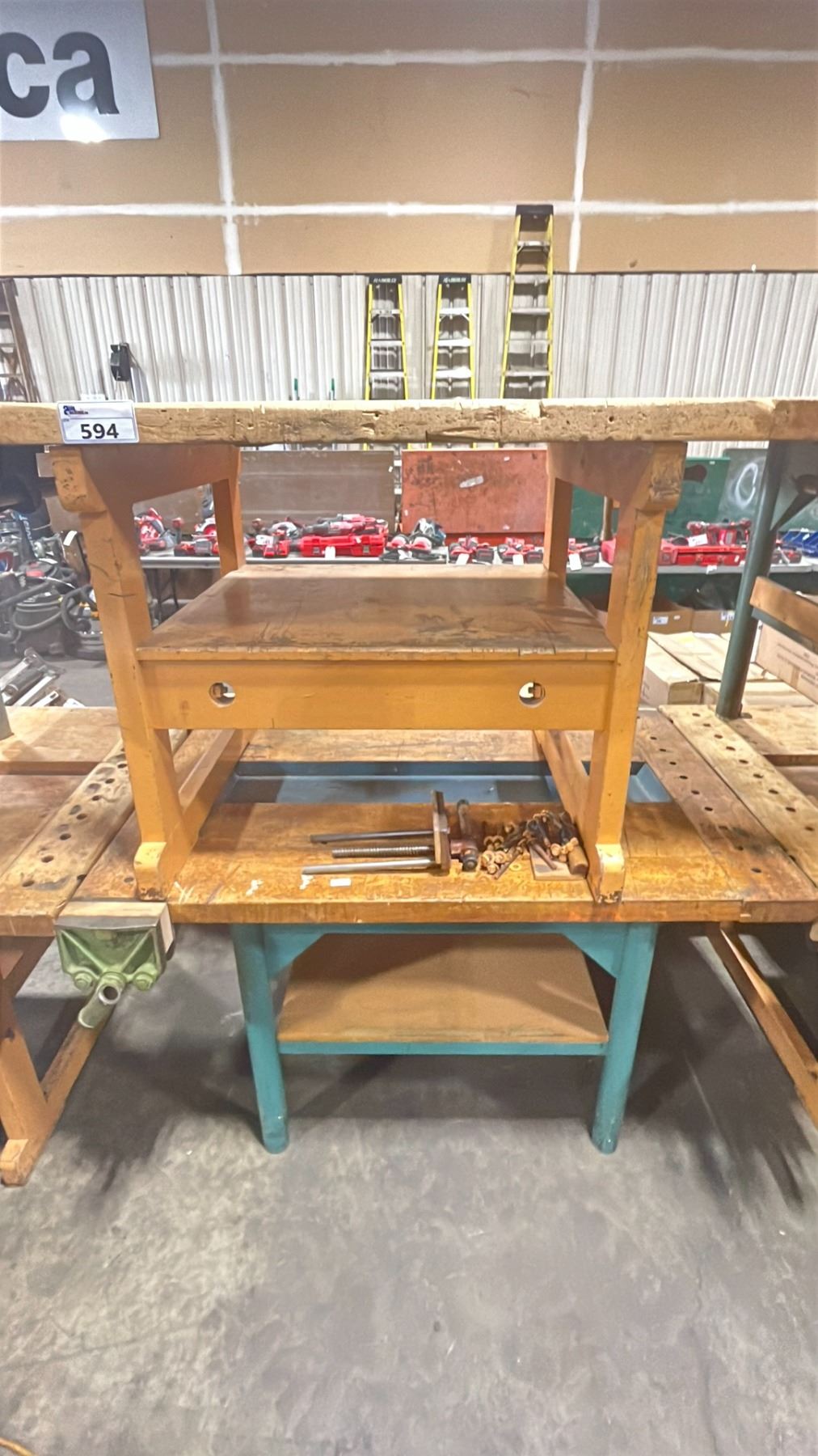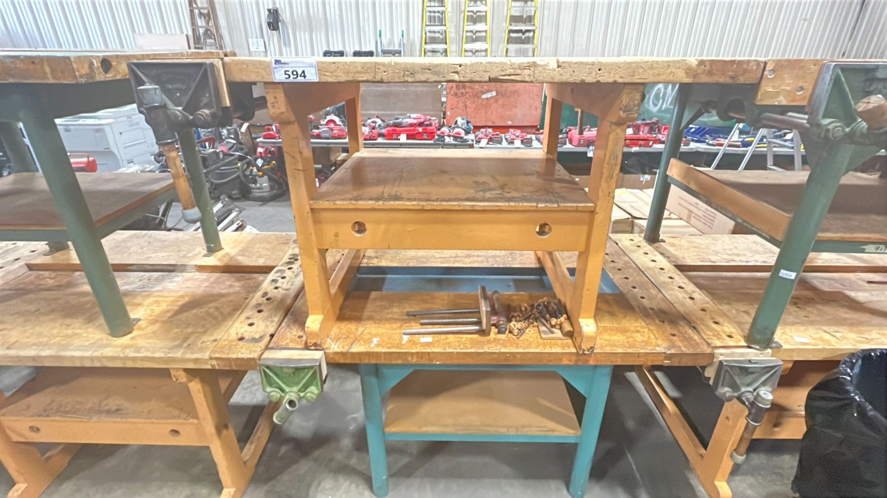 PAIR OF INDUSTRIAL WORK TABLES DIFFERENT SHAPES AND DIMENSIONS BOTH WITH TWO TABLE VISES ON EITHER SIDE