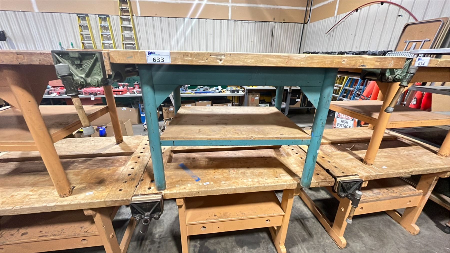 PAIR OF INDUSTRIAL WORK TABLES DIFFERENT SHAPES AND DIMENSIONS BOTH WITH TWO TABLE VISES ON EITHER SIDE