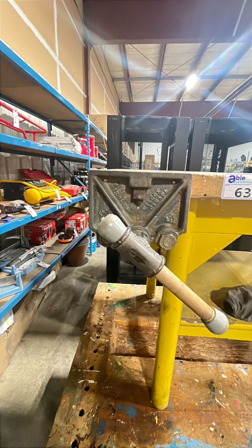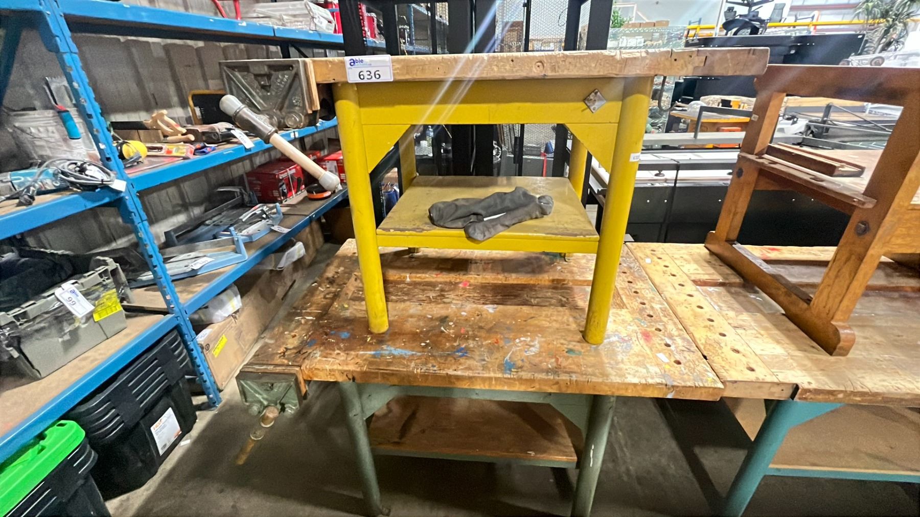 PAIR OF INDUSTRIAL WORK TABLES DIFFERENT SHAPES AND DIMENSIONS BOTH WITH TWO TABLE VISES ON EITHER SIDE