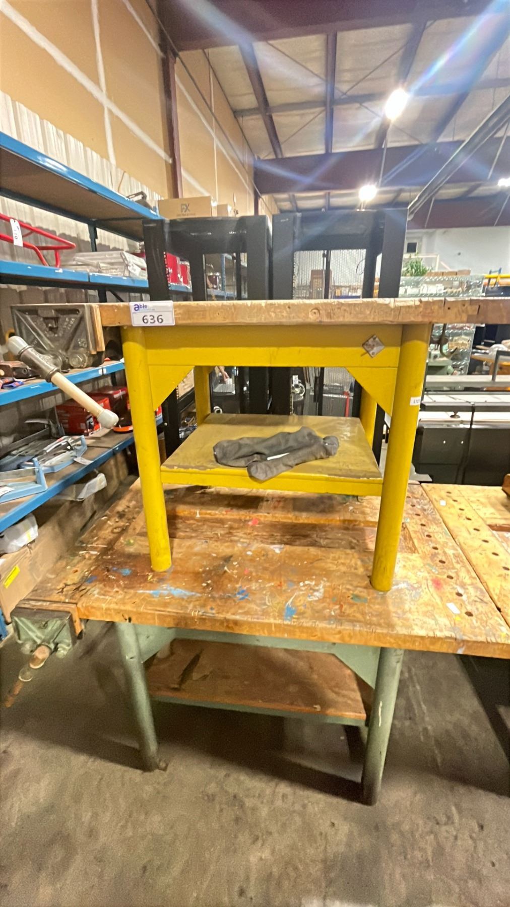 PAIR OF INDUSTRIAL WORK TABLES DIFFERENT SHAPES AND DIMENSIONS BOTH WITH TWO TABLE VISES ON EITHER