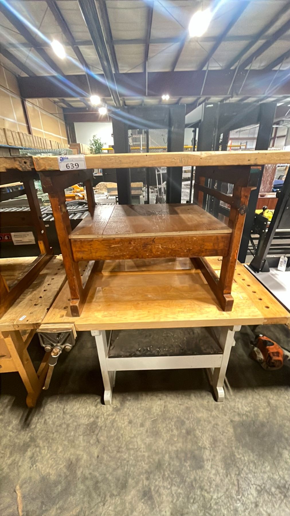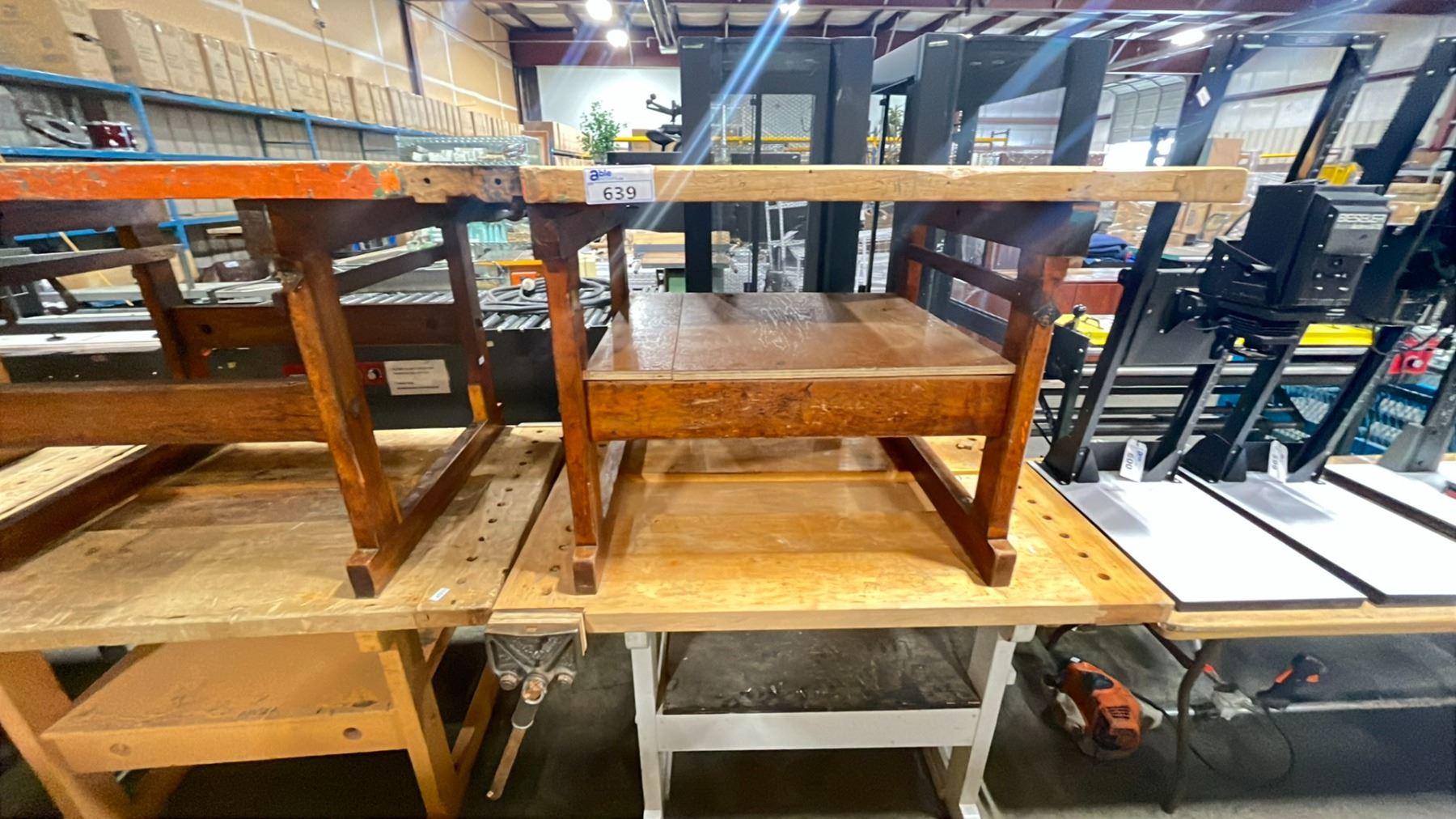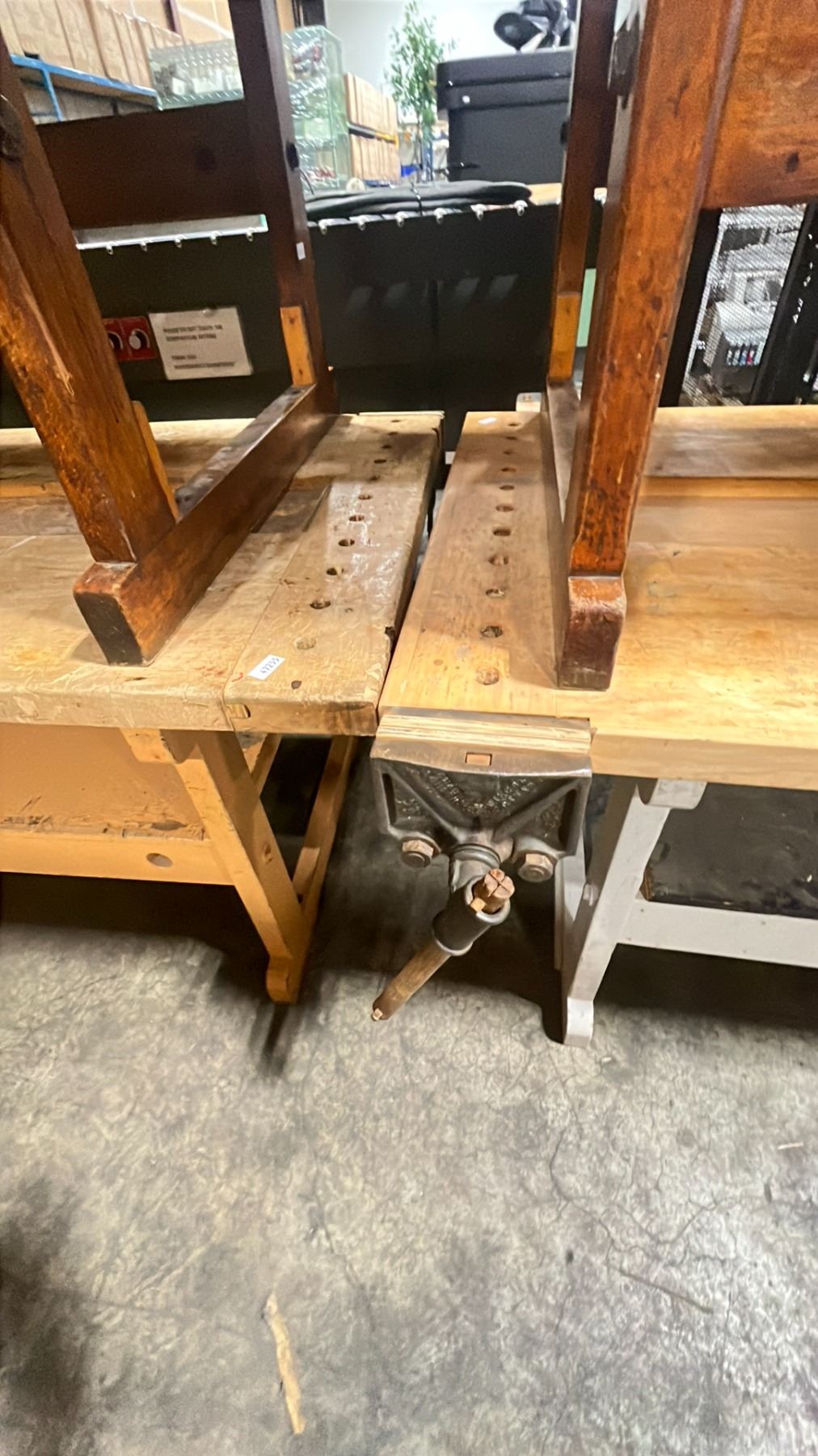 PAIR OF INDUSTRIAL WORK TABLES DIFFERENT SHAPES AND DIMENSIONS ONLY ONE WITH TWO TABLE VISES ON EITHER SIDE