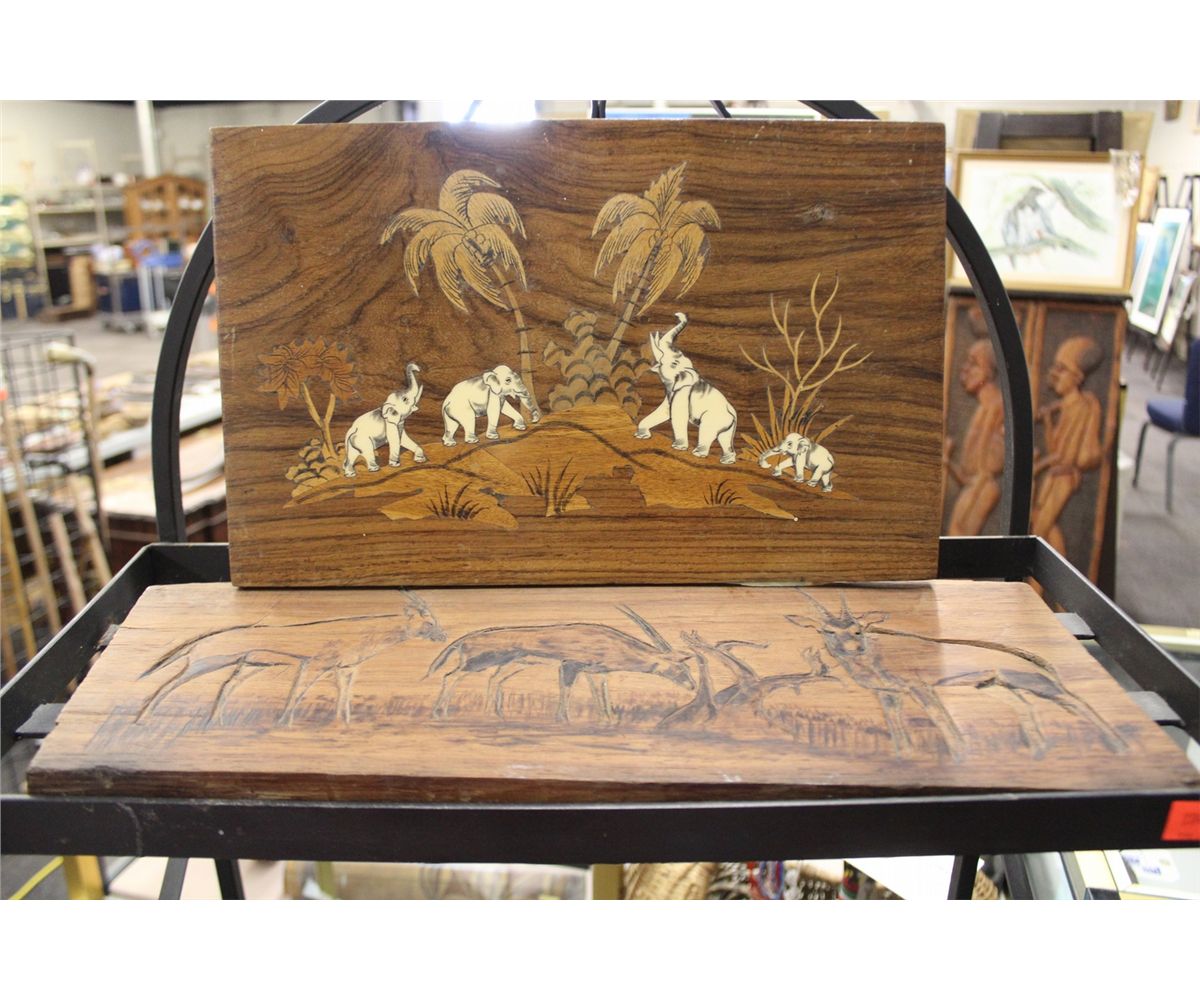 PAIR OF INLAID WOODEN PLAQUES- ELEPHANTS AND ORYX
