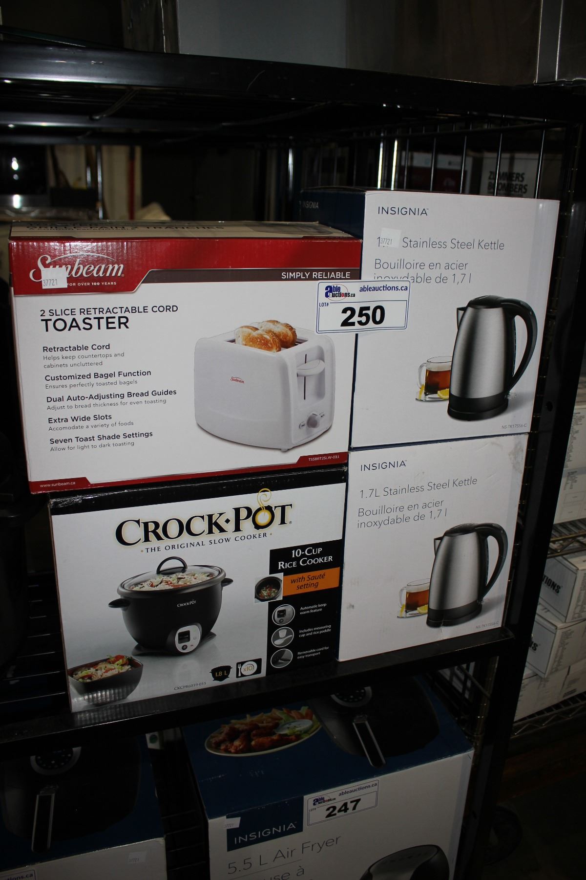 PAIR OF INSIGNIA KETTLES, CROCK-POT RICE COOKER AND SUNBEAM TOASTER