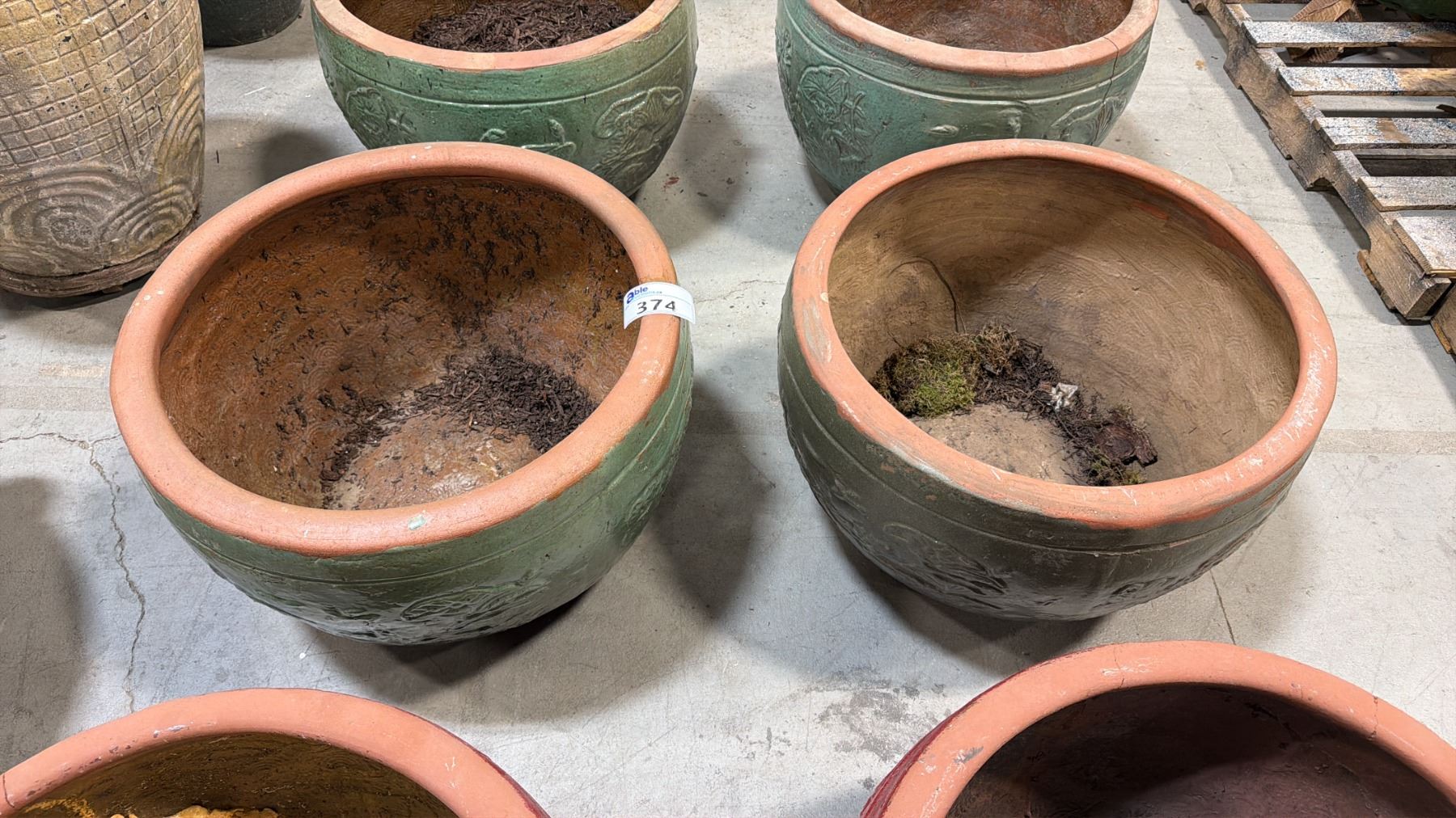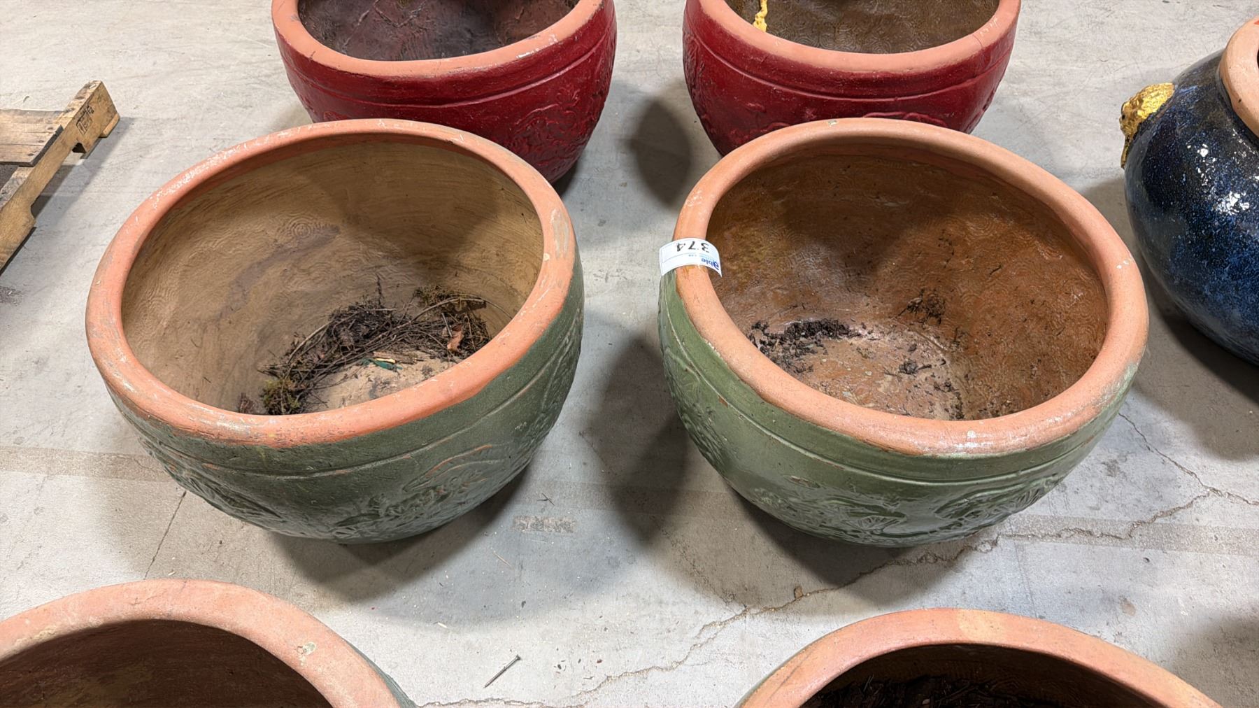 PAIR OF LARGE GREEN CERAMIC PLANTER POTS APPROX 2.1'W X 1.4'H