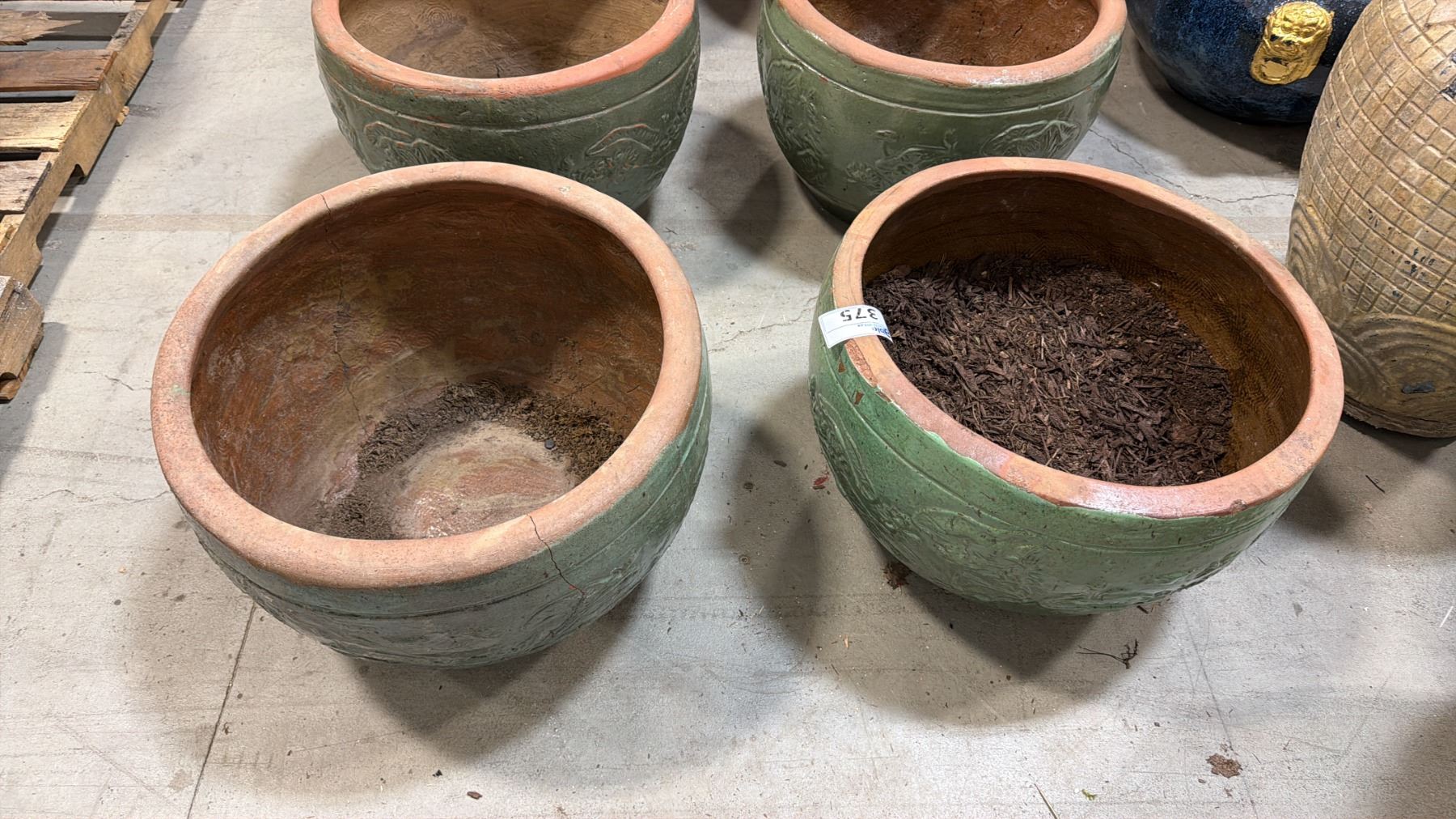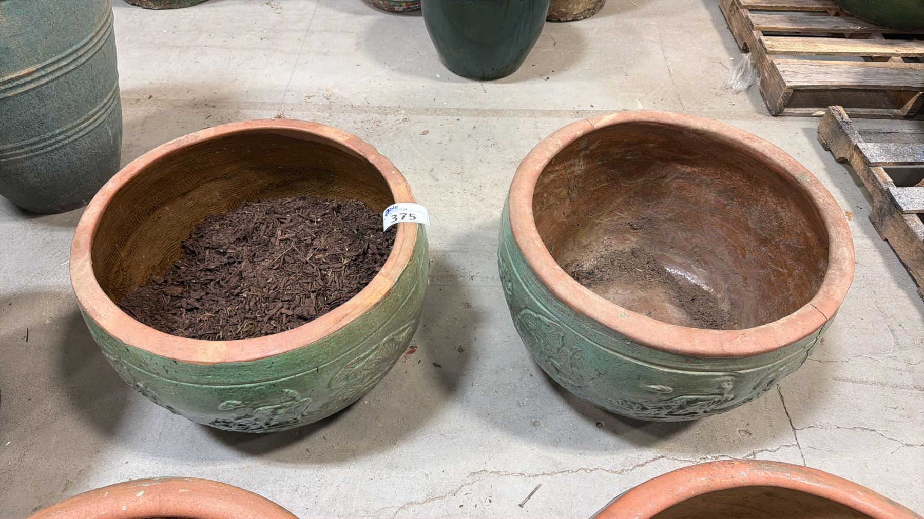 PAIR OF LARGE GREEN CERAMIC PLANTER POTS APPROX 2.1'W X 1.4'H