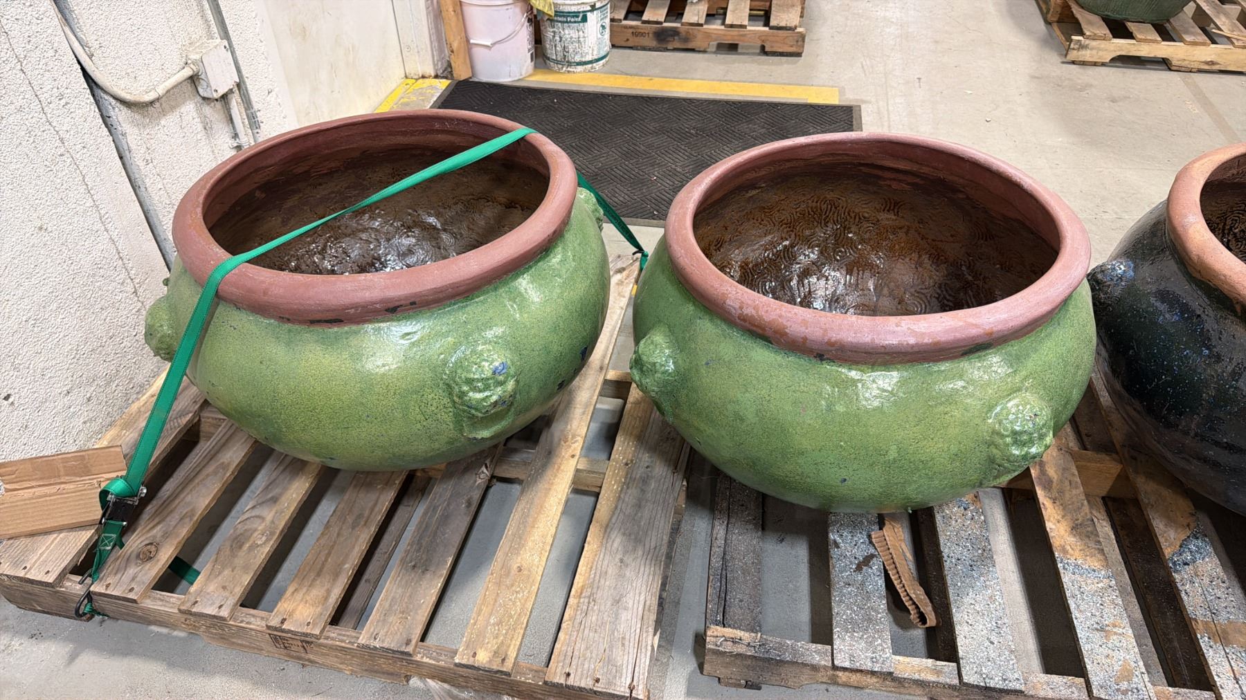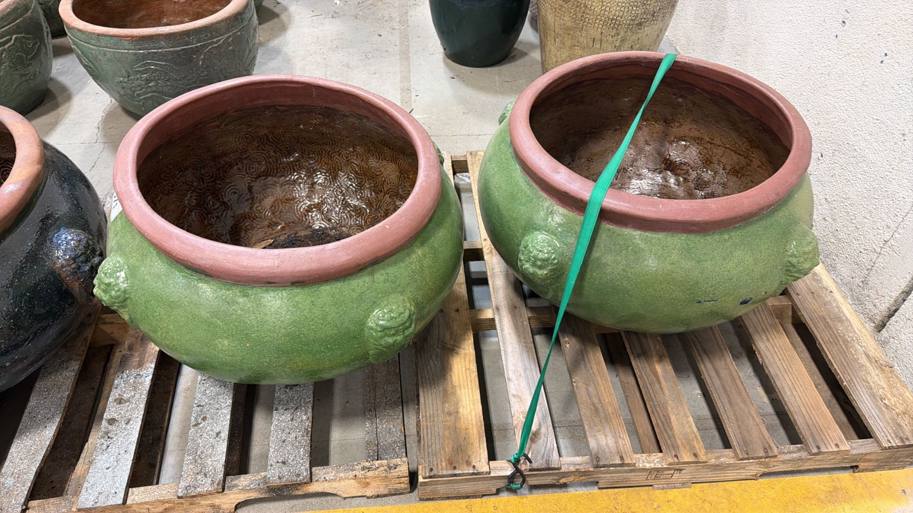 PAIR OF LARGE GREEN CERAMIC PLANTER POTS APPROX 2.1'W X 1.7'H