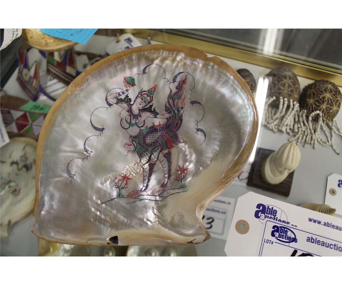 PAIR OF LARGE SEASHELLS, HAND PAINTED INDIAN IMAGERY