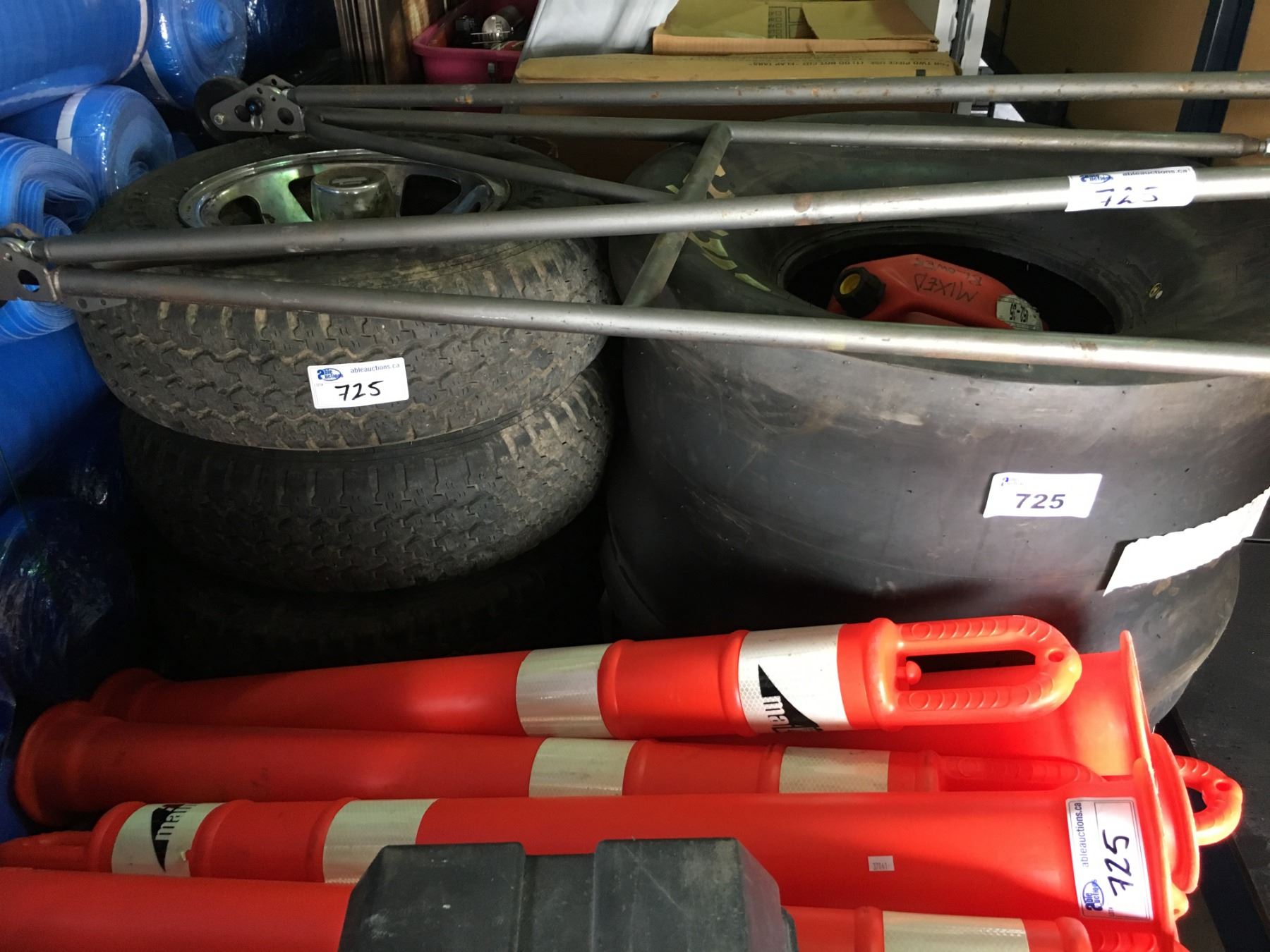 PAIR OF M/T DRAG RACING TIRES, SET OF LT215/75 R15 TRUCK TIRES WITH RIMS & ASSORTED DELINEATORS