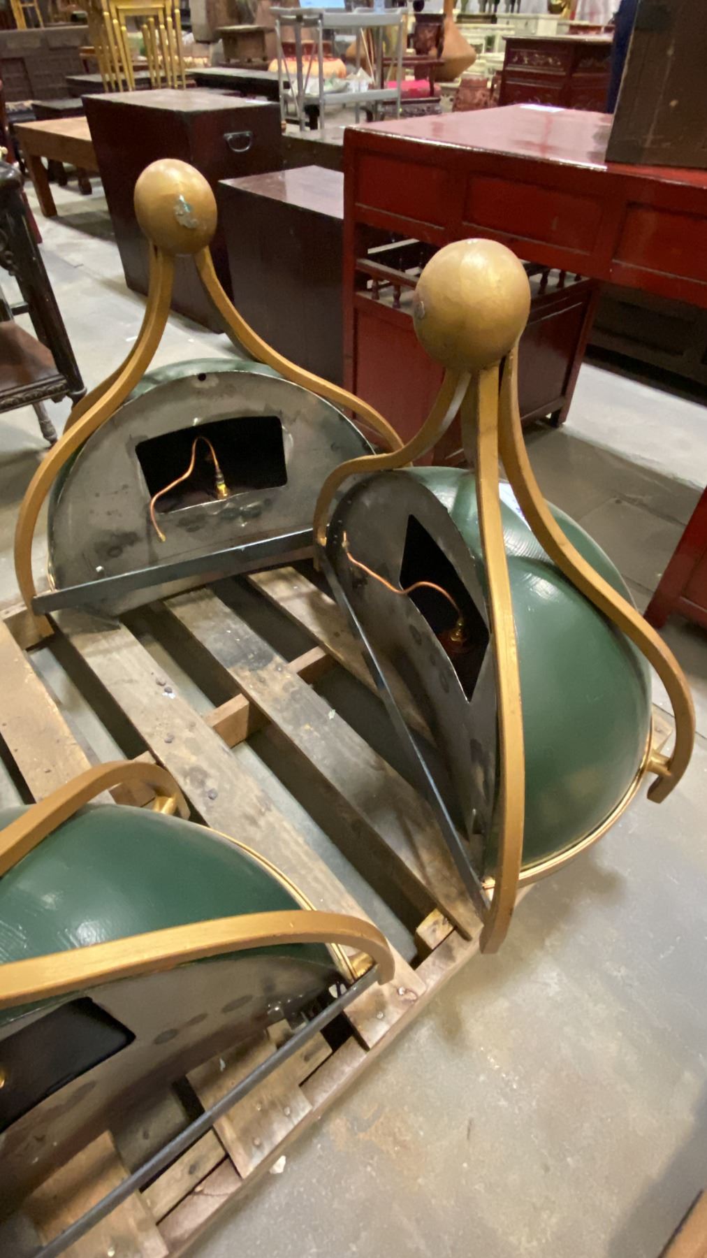 PAIR OF METAL GREEN AND GOLD WALL MOUNT HEATING SCONCES