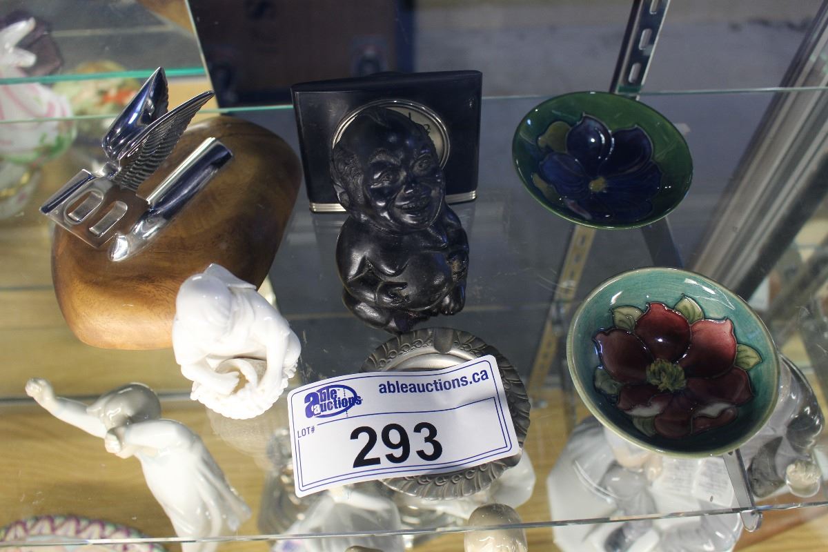 PAIR OF MOORCROFT DISHES, CLOCK, ASHTRAY AND OTHER ITEMS