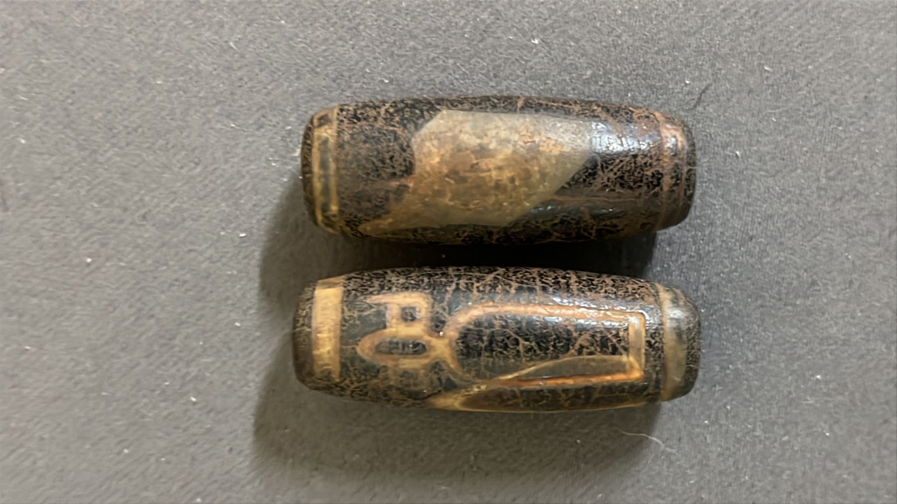 PAIR OF MOTTLED RUSSET DZI BEADS