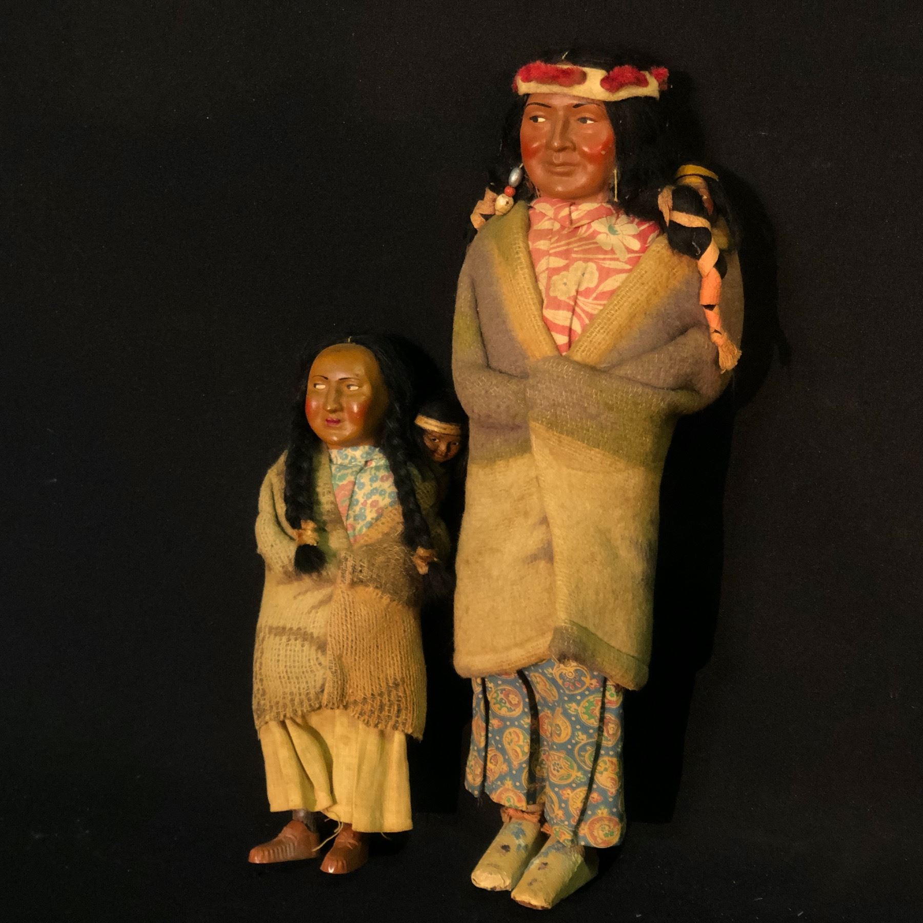 PAIR OF NATIVE AMERICAN SKOOKUM DOLLS WITH CHILDREN, USA, 15.5" & 10.5" TALL