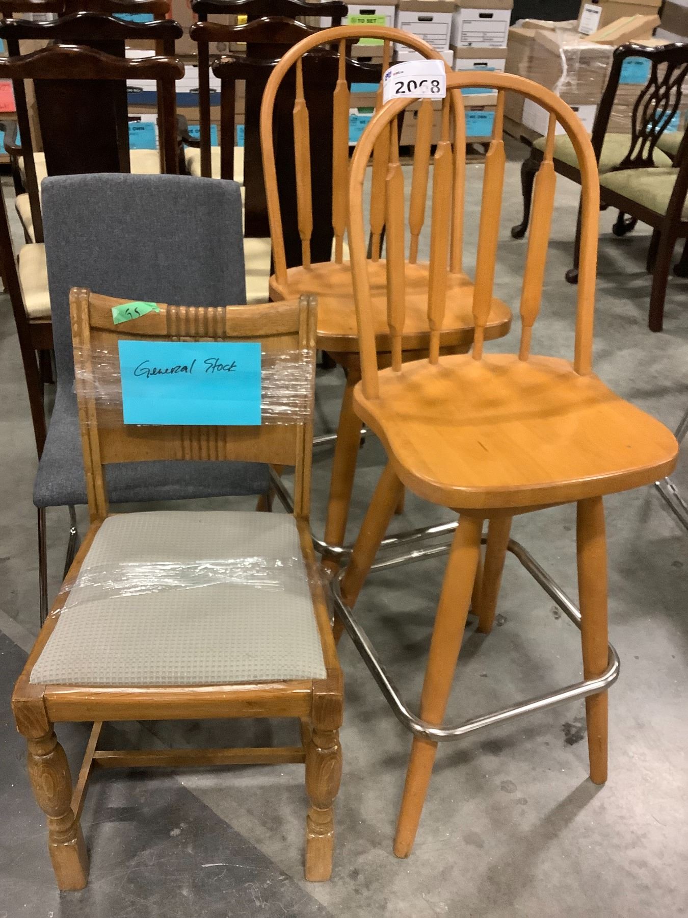 PAIR OF PINE BAR STOOLS AND 2 DINING CHAIRS