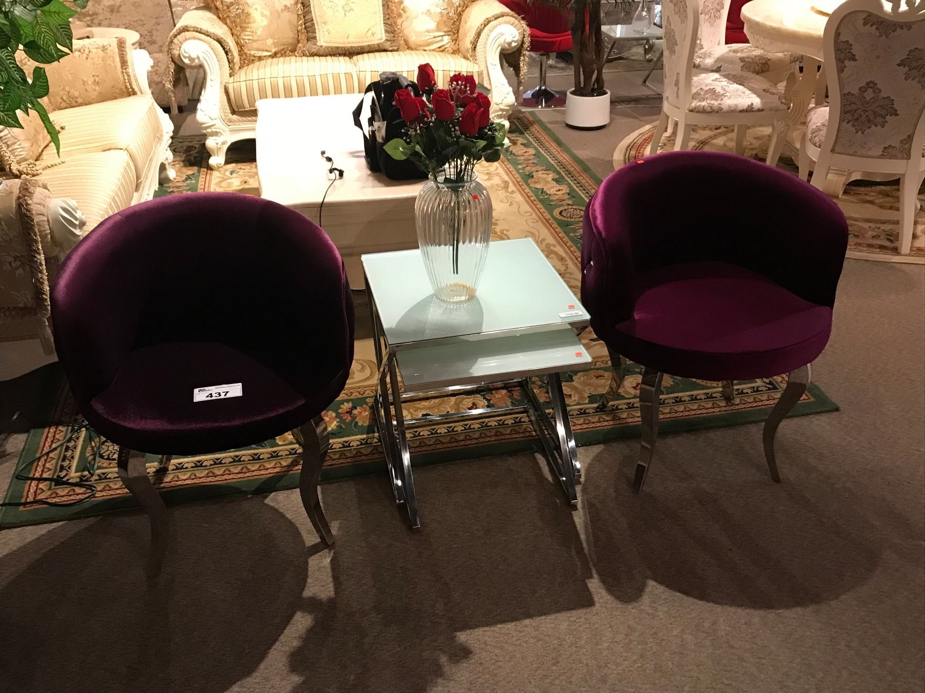 PAIR OF PURPLE MICROFIBER TUB CHAIRS, MODERN GLASS NESTING TABLES & VASE WITH FAUX ROSES