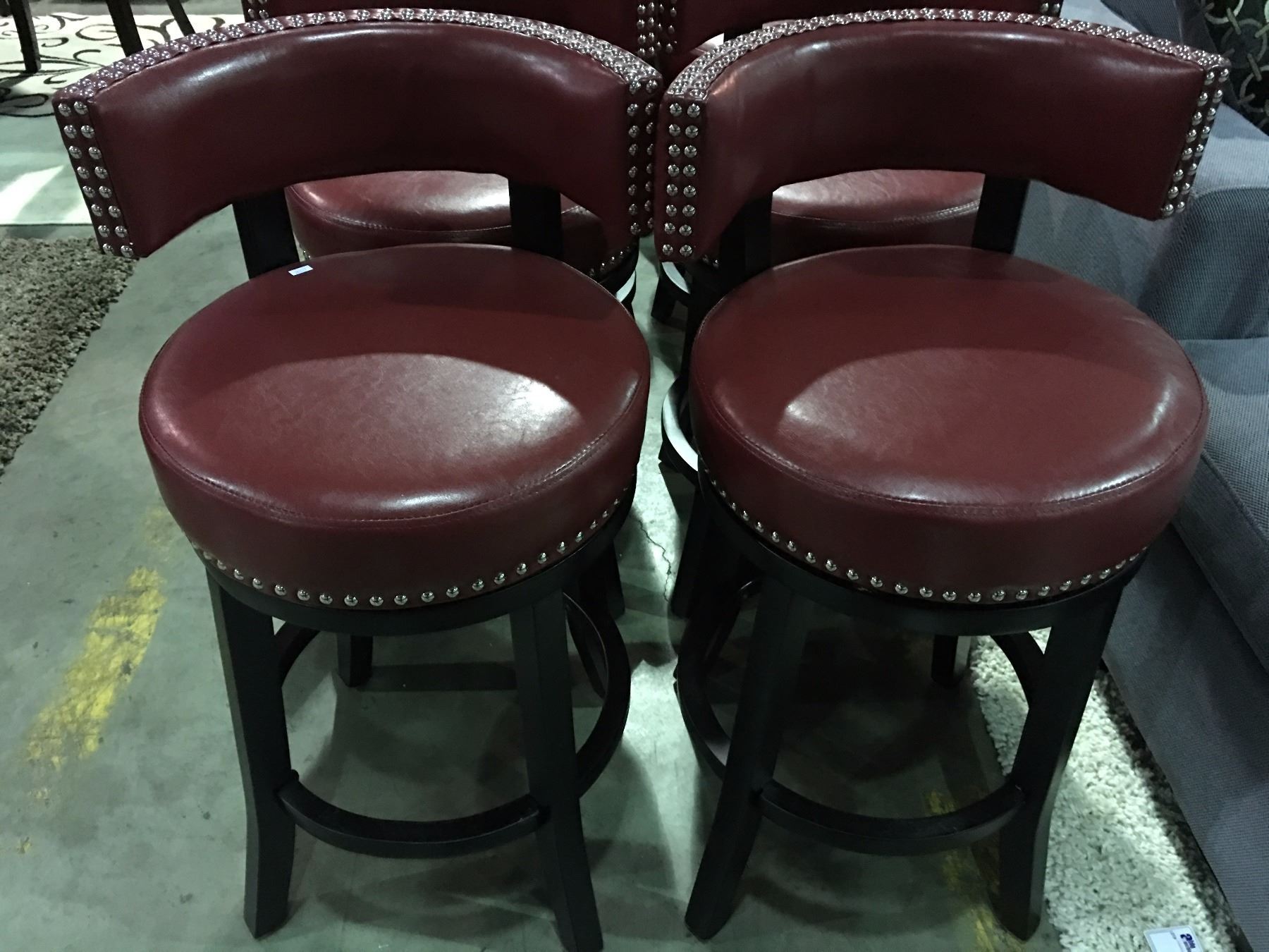 PAIR OF RED LEATHER STUDDED, UPHOLSTERED 24" BARSTOOLS