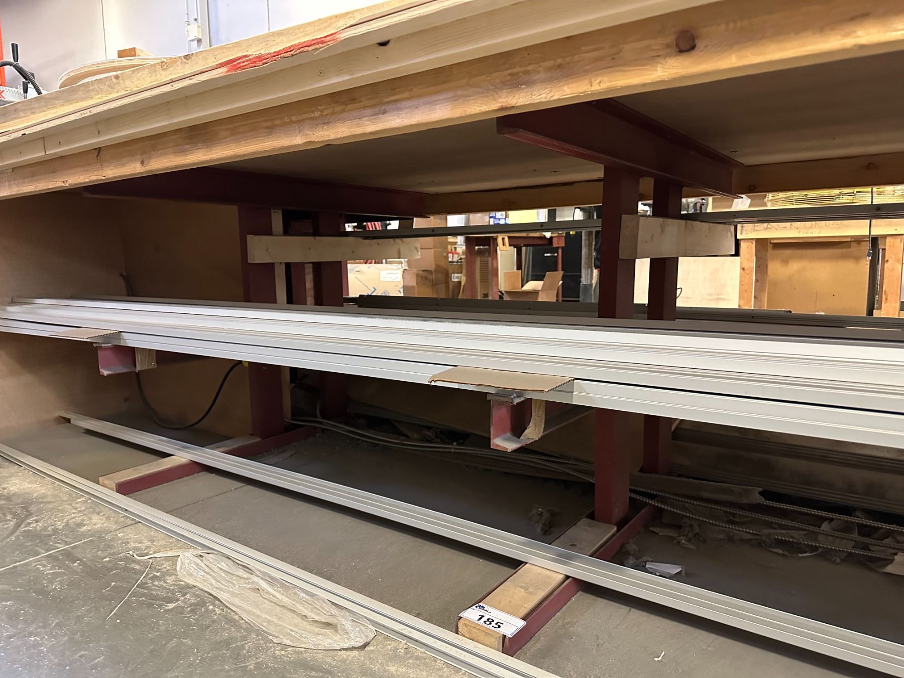 *PAIR OF RED METAL 3 TIER DOUBLE SIDED MATERIAL STORAGE CANTILEVER RACKS 3' X 54" (MUST DISMANTLE TABLE AROUND RACK