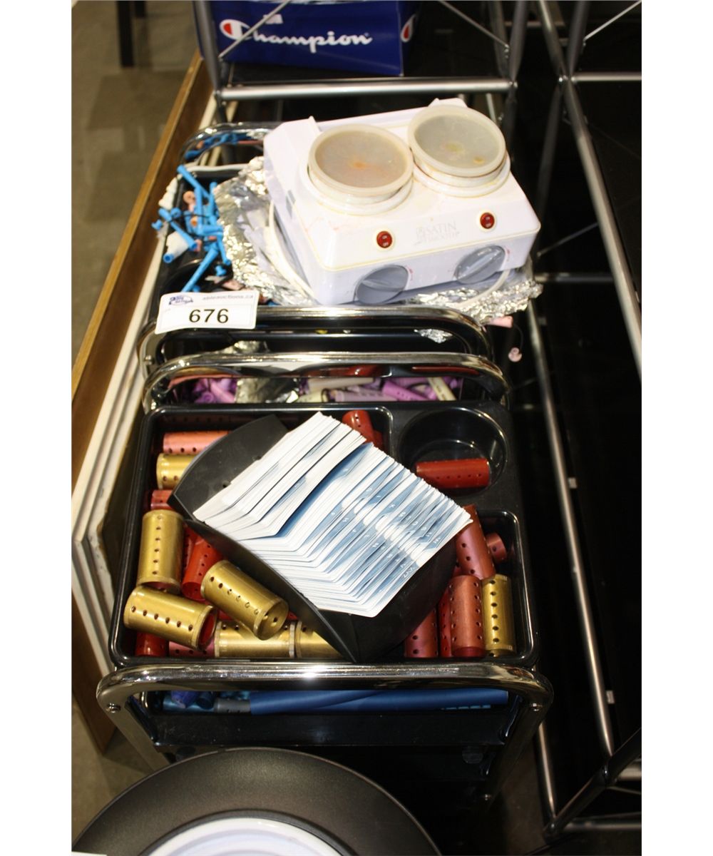 PAIR OF ROLLING STANDS WITH HAIR CURLERS AND MORE