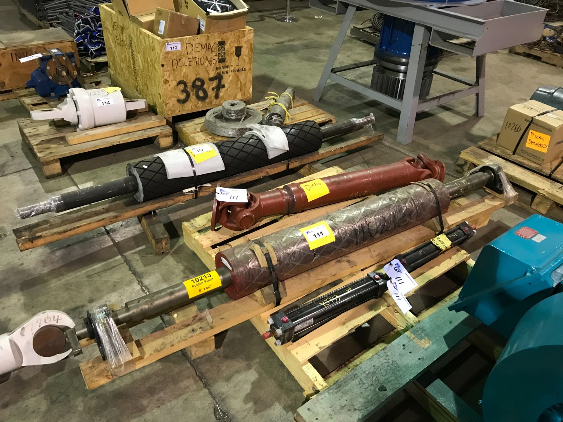 PAIR OF ROYAL HYDRAULIC CYLINDERS, PAIR OF 8" X 46" RUBBER CONVEYOR ROLLERS & HEAVY DUTY DRIVE SHAFT