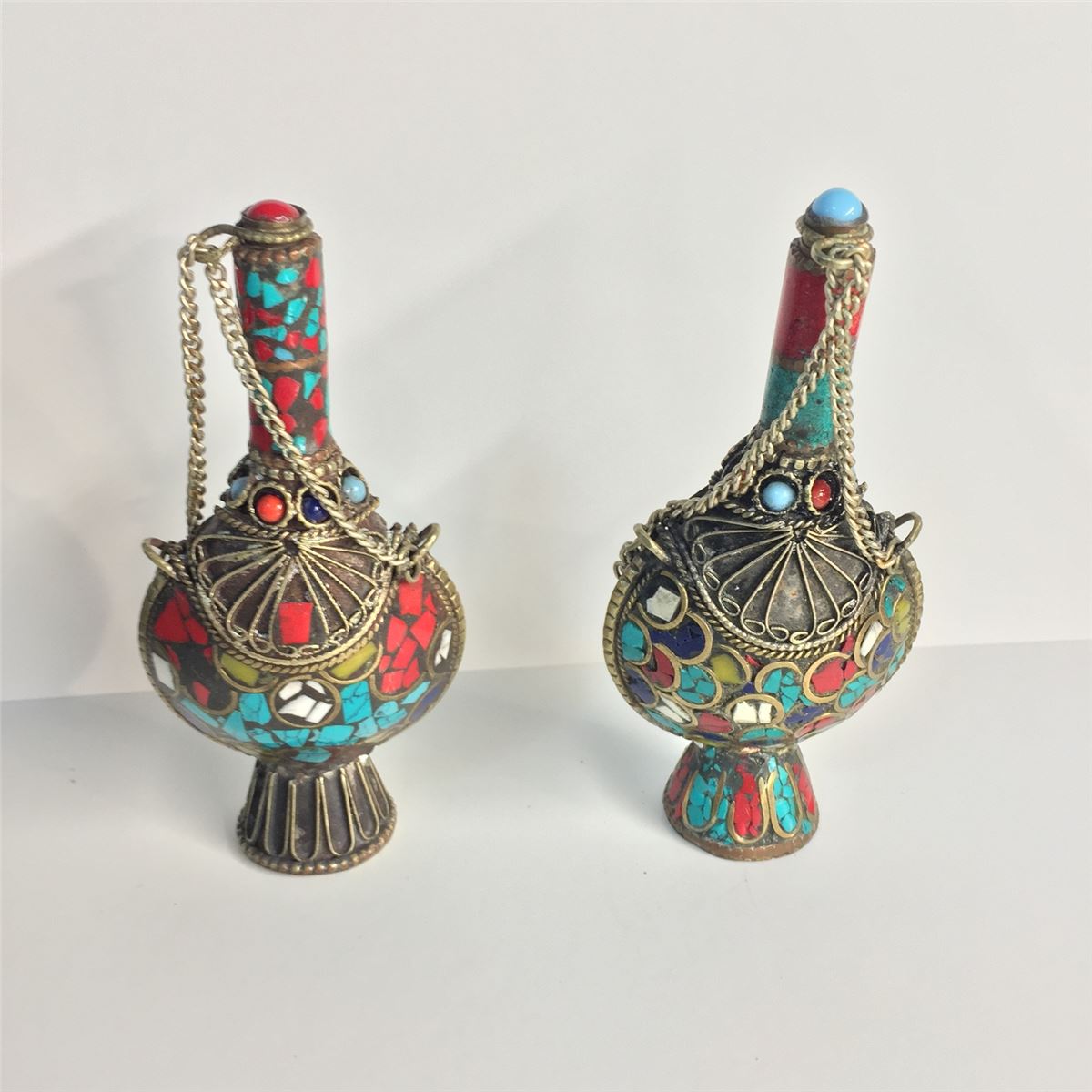 PAIR OF SCENT BOTTLES INLAID WITH SEMI PRECIOUS STONES