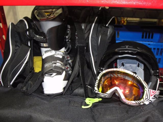 PAIR OF SKIIS, BOOTS, AND HELMET WITH BAGS