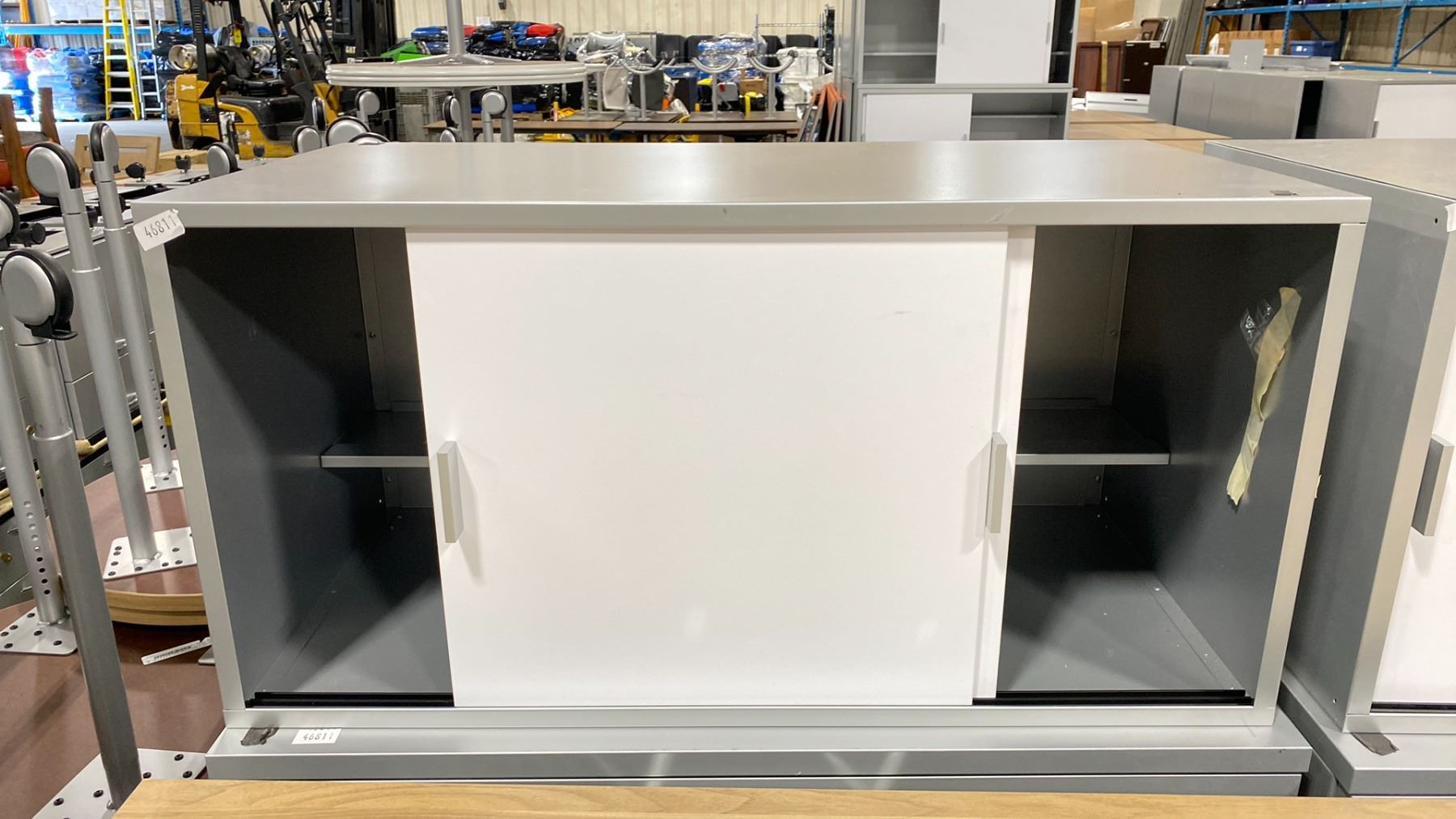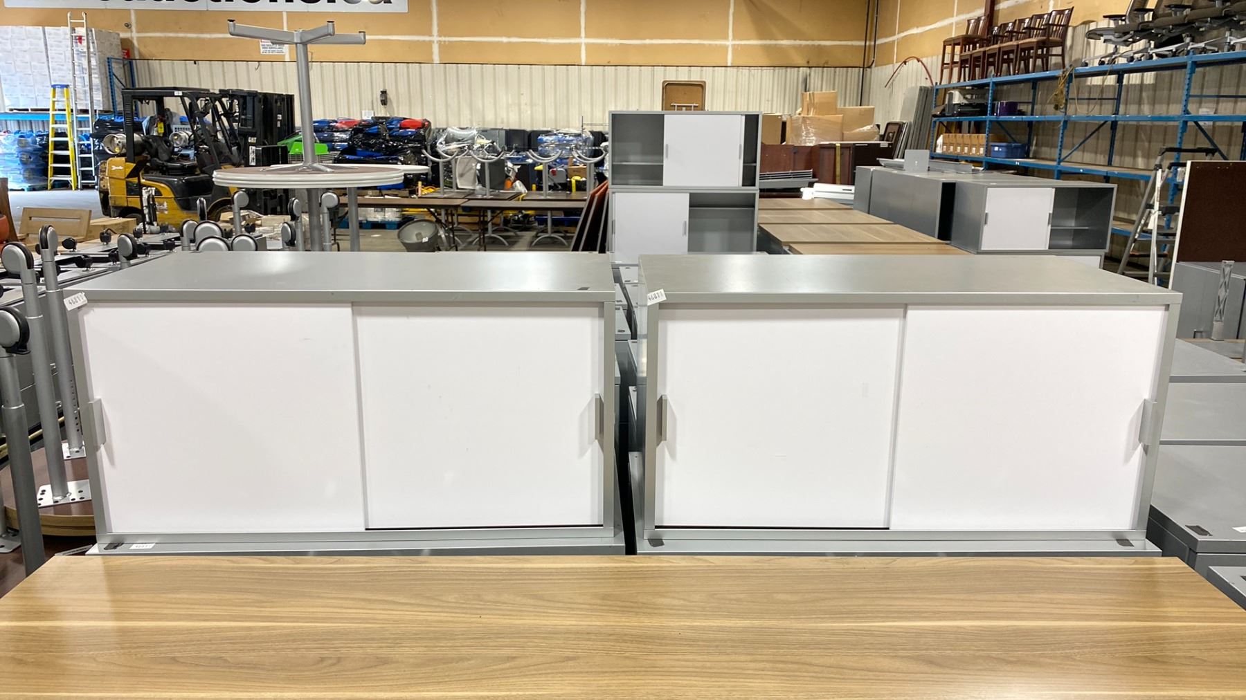 PAIR OF STEELCASE WHITE / GREY METAL 2 SLIDING DOOR WALL HUNG STORAGE CABINETS SIZE 35 1/4"W X 18"D X 17 3/4"H EACH