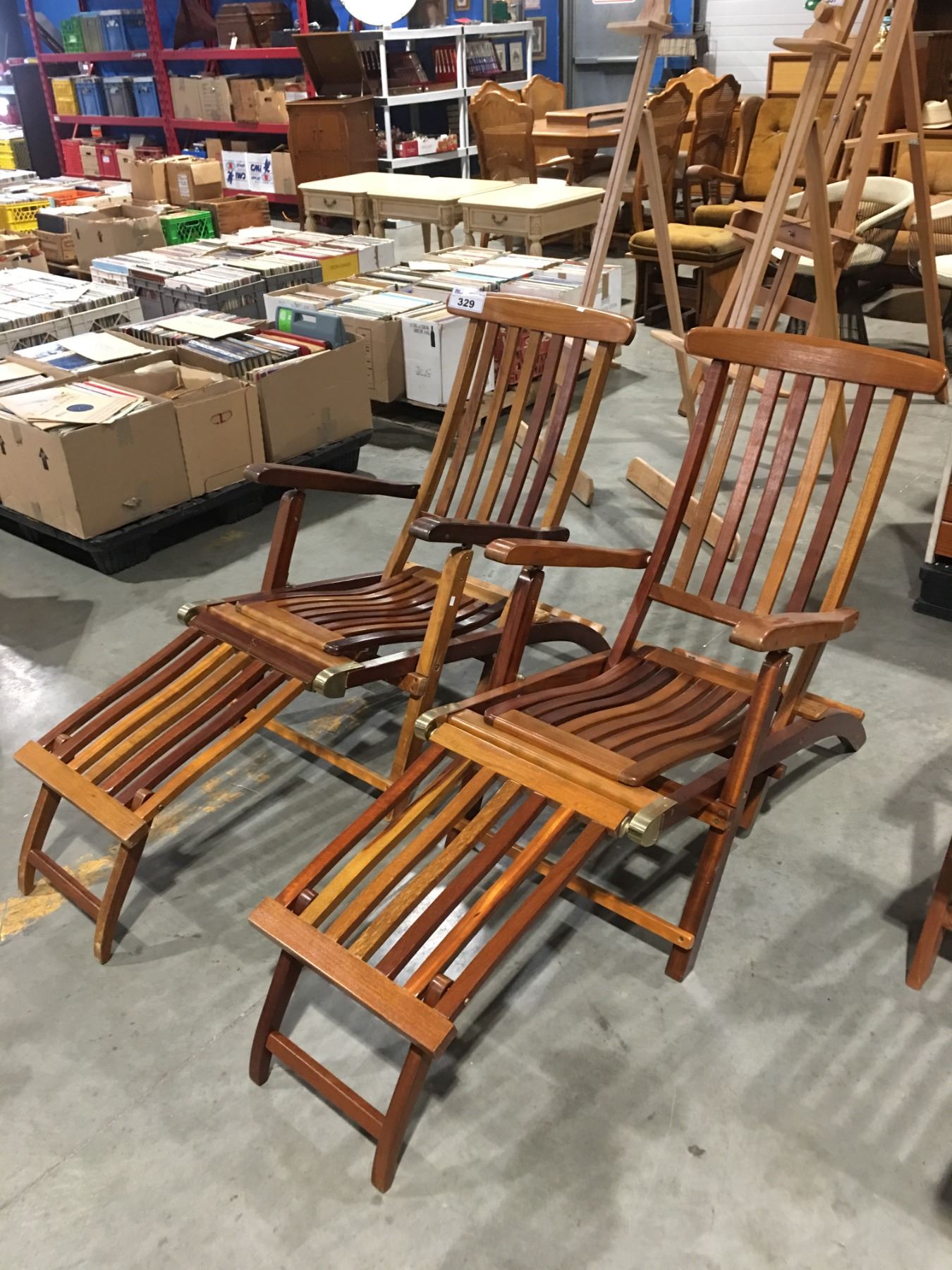 PAIR OF TEAK DECK LOUNGE CHAIRS WITH BLACK CUSHIONS