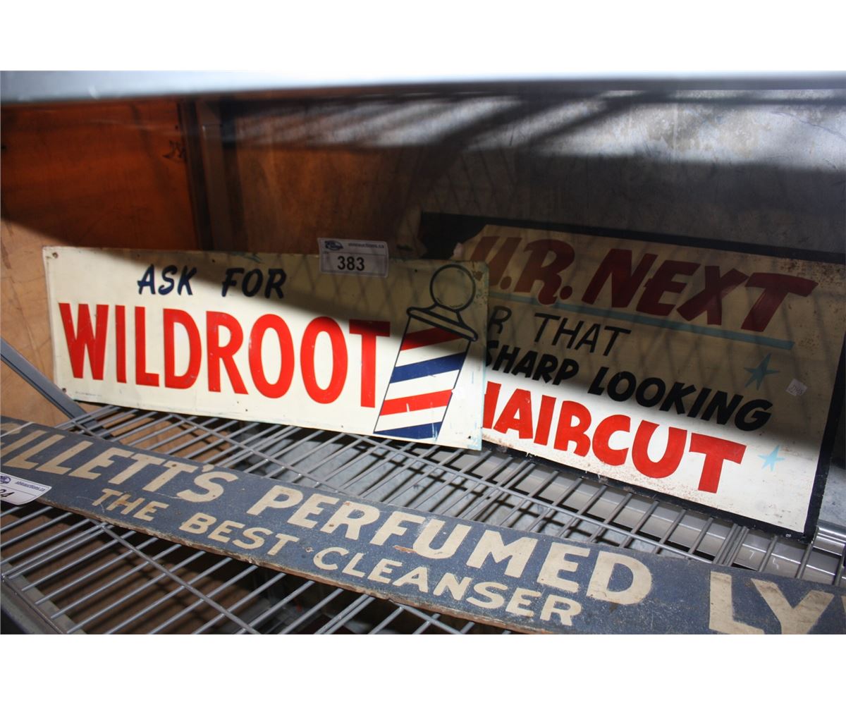PAIR OF VINTAGE TIN BARBER SHOP SIGNS; WILD ROOT AND YOUR NEXT HAIRCUT