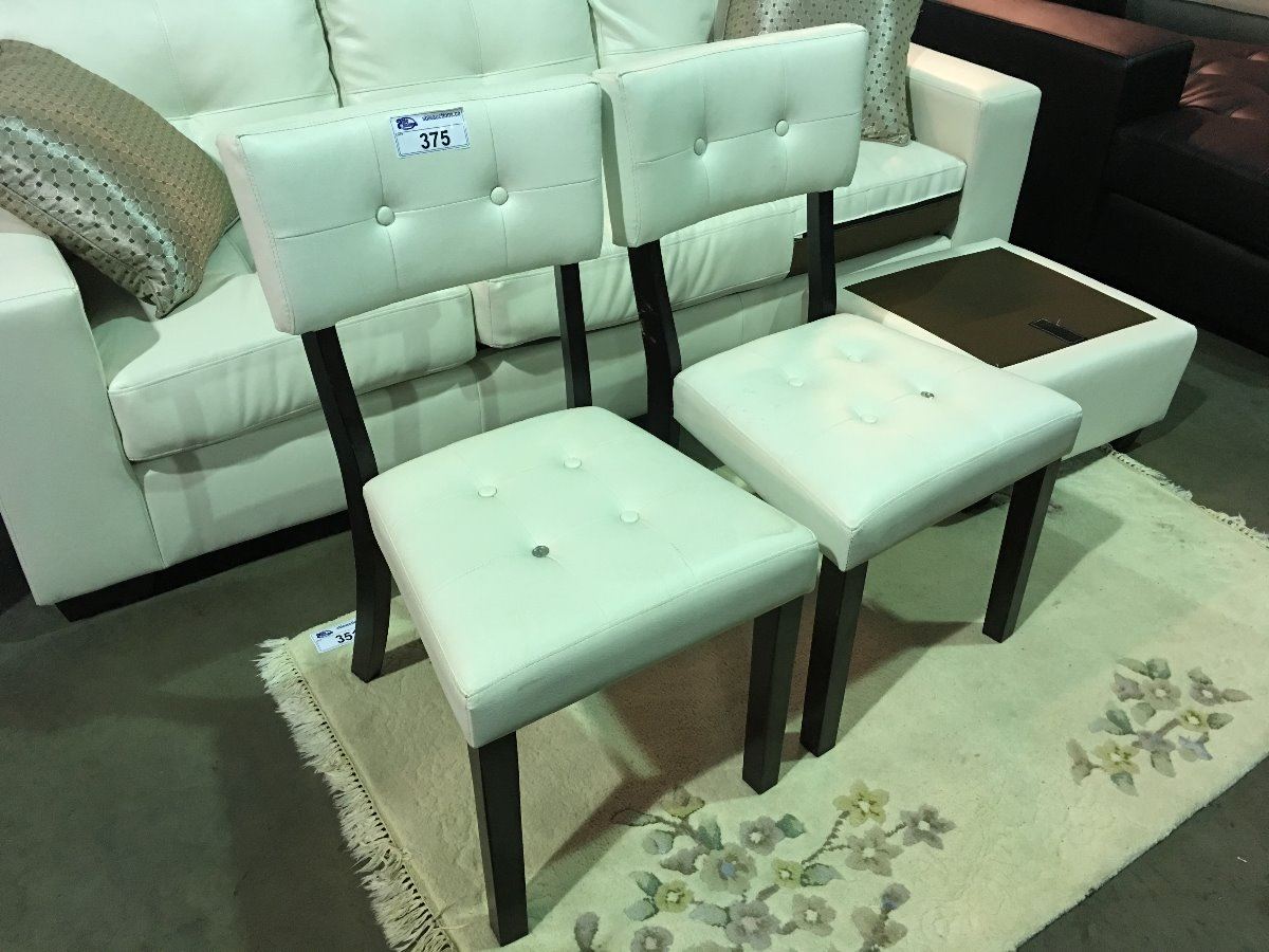 PAIR OF WHITE LEATHER UPHOLSTERED SIDE CHAIRS ( 2 BUTTON CAPS MISSING)