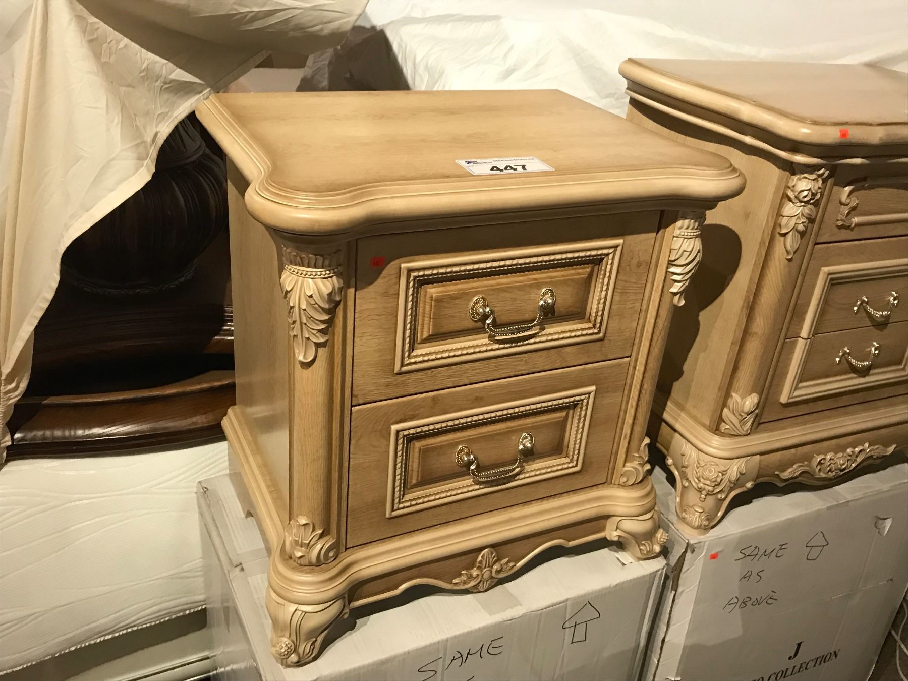PAIR OF WHITE ORNATE WOODEN NIGHT STANDS